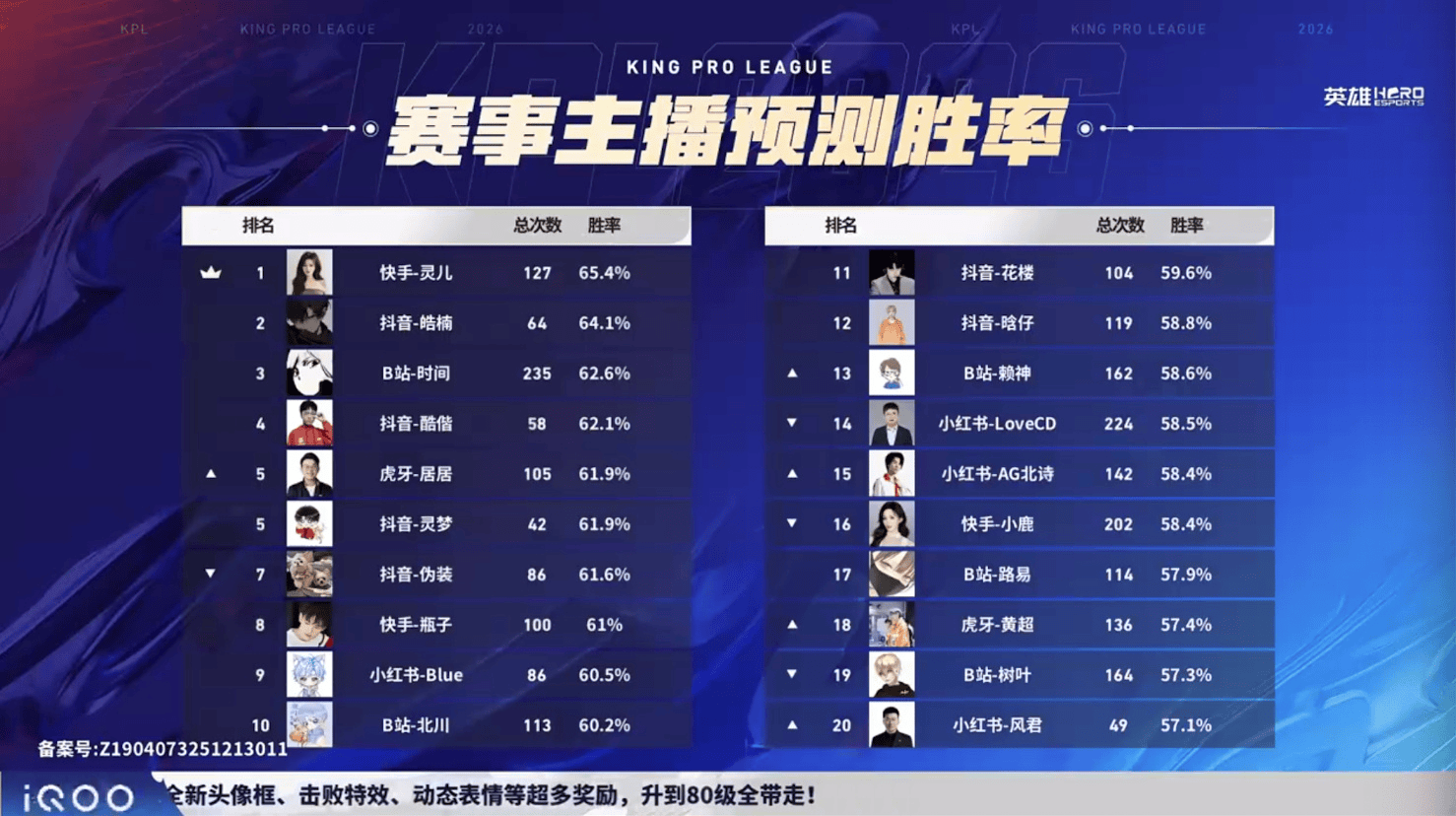 快手-灵儿胜率65.4%,位于排行榜第一。