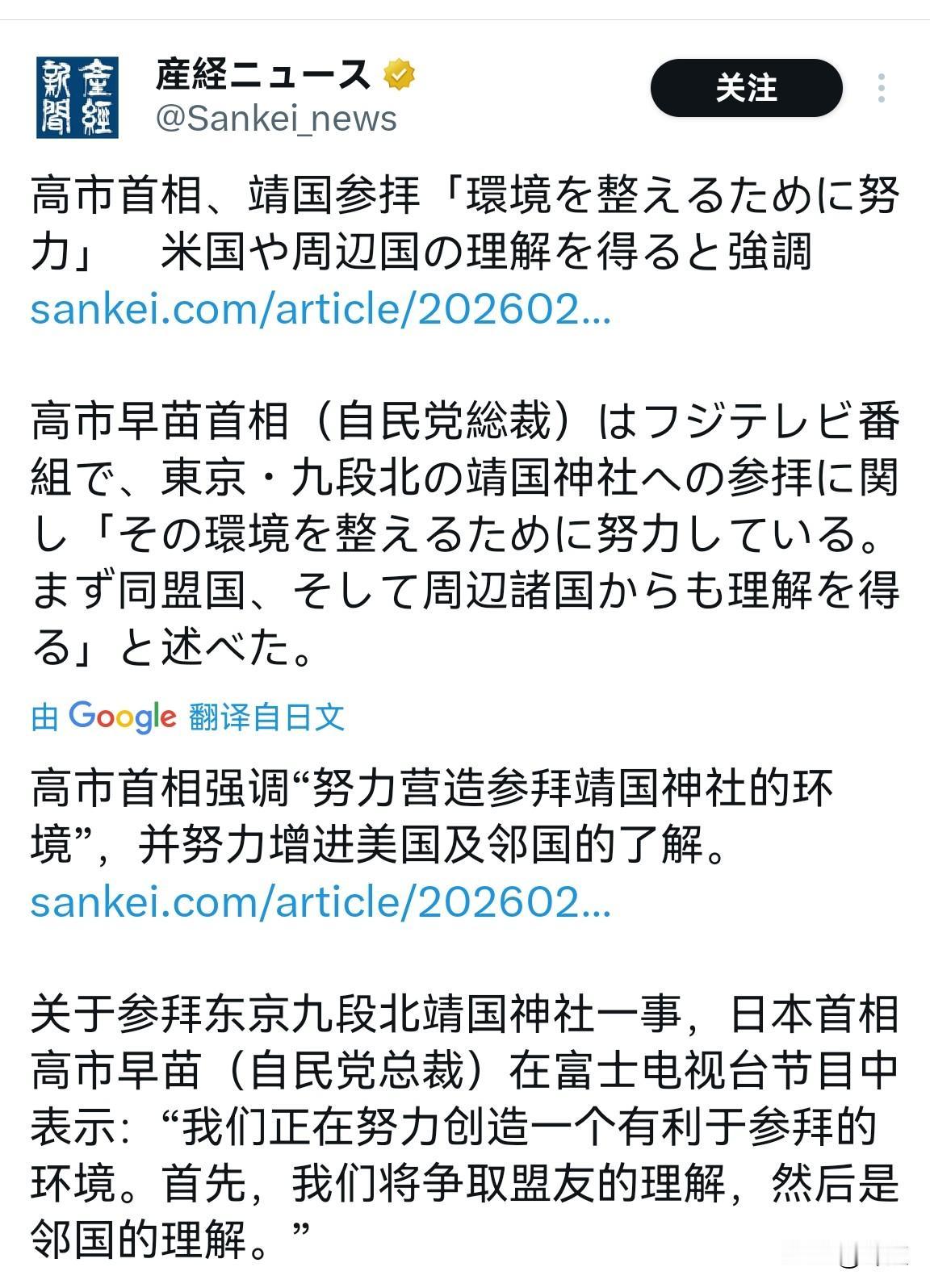 高市早苗让邻国理解其参拜靖国神社! 日媒报道,她在富士电视台谈及参拜靖国神社问题时表示:“我们正在创造一个合适的参拜环境。首先,我们需要获得盟国和邻国的理解。” 🔻锋评:作为被日本在二战期间,侵略过的各个国家,不会,也不可能理解日本政府的“拜鬼”行为。这不仅是以高市早苗为首的日本右翼篡改历史、否定战争罪行的无耻表现,更是对其侵略过的亚洲各个邻国的情感挑衅和侮辱! 这种要求受害国“理解”的言论,实在让人愤怒!以高市早苗为首的日本右翼,未来一定会付出代价!