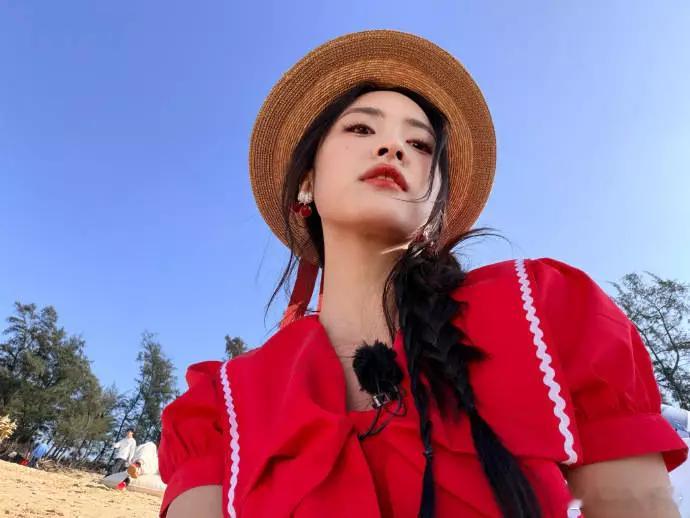 分享娱乐沈月穿红裙配草帽度假风拉满耳戴樱桃耳坠显少女感