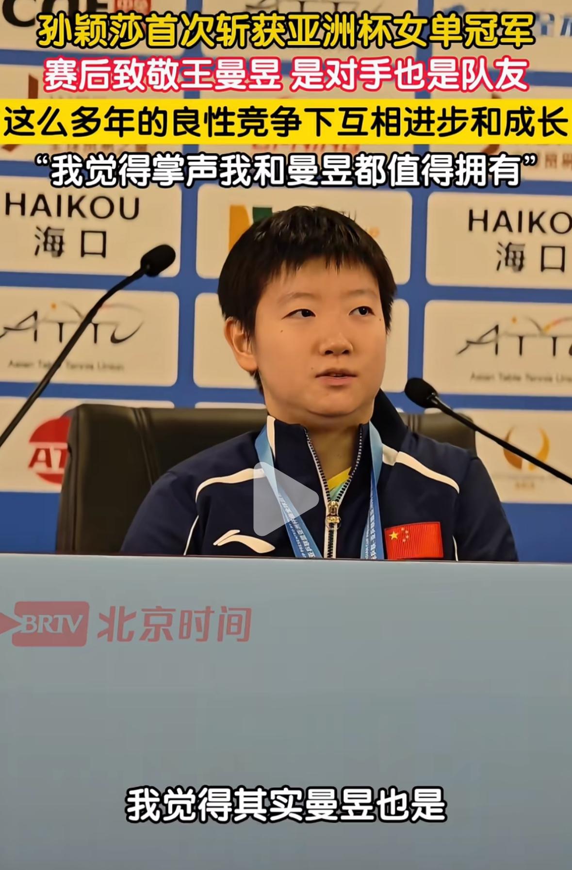 孙颖莎赛后致敬王曼昱:是对手更是队友,我们在良性竞争下互相进步和成长,我觉得掌声我和曼昱都值得拥有!” 孙颖莎4:3险胜王曼昱夺得首个 亚洲杯女单冠军🏆, 赛后的新闻发布会上, 孙颖莎高度评价了王曼昱: “我觉得曼昱一直以来都是我非常 尊敬的对手,更是队友, 其实从小到大, 我们打了这么多年的比赛, 而且平时一起训练, 也一起搭档女双, 在这么多年的良性竞争下, 我们也是彼此看着对方 互相进步和成长, 对于我们两个人来说, 都是彼此进步的目标, 我觉得掌声我和曼昱都值得拥有!” 孙颖莎这发言,这格局, 真让人敬佩, 孙颖莎的内涵丰富, 祝贺队友,肯定对手, 是运动员里少有的睿智思维, 君子以厚德载物, 德高才能致远, 孙颖莎和王曼昱都是值得我们敬佩的运动员!