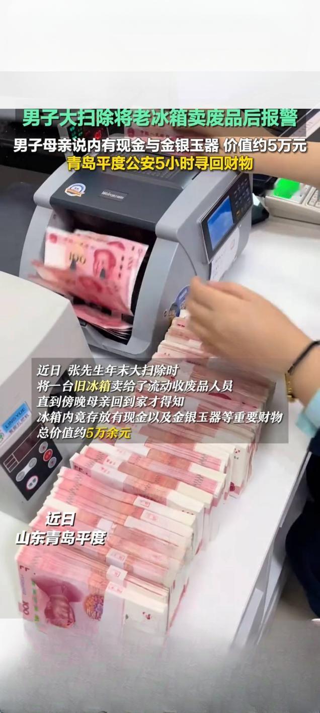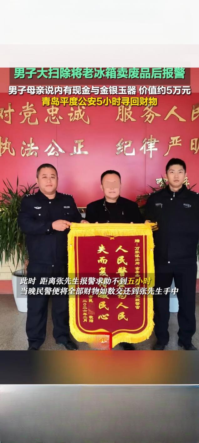 男子大扫除误卖旧冰箱 平度公安5小时寻回5万元财物 1月31日,青岛平度市民张先生在年末大扫除时,将家中一台老旧冰箱卖给流动收废品人员,傍晚母亲回家后发现,这台冰箱内竟藏有现金、金银首饰及玉器挂件等贵重财物,总价值约5万元,张先生当即向平度市公安局万家派出所报警求助。 接警后,民警迅速赶赴现场,详细询问冰箱变卖时间、回收人员体貌特征、车辆信息及财物细节,随即开展排查工作。通过调取周边监控、整合多方线索,民警很快锁定回收车辆,连夜赶往南村镇沙岭村一处回收站,在堆积的废旧物品中找到这台冰箱,所幸财物未被处理,经清点完好无损。从张先生报警到寻回财物,全程仅用不到5小时,当晚民警便将全部财物交还至张先生手中。 2月4日,张先生特意制作锦旗送到万家派出所表达感谢,民警戏称这是见过“含金量”最高的冰箱。平度公安借此提醒,市民处理废旧家电、家具前,务必仔细检查隐蔽部位,确认无贵重物品、重要证件遗留,子女也应多与老人沟通,避免此类乌龙事件发生。 平度回收冰箱