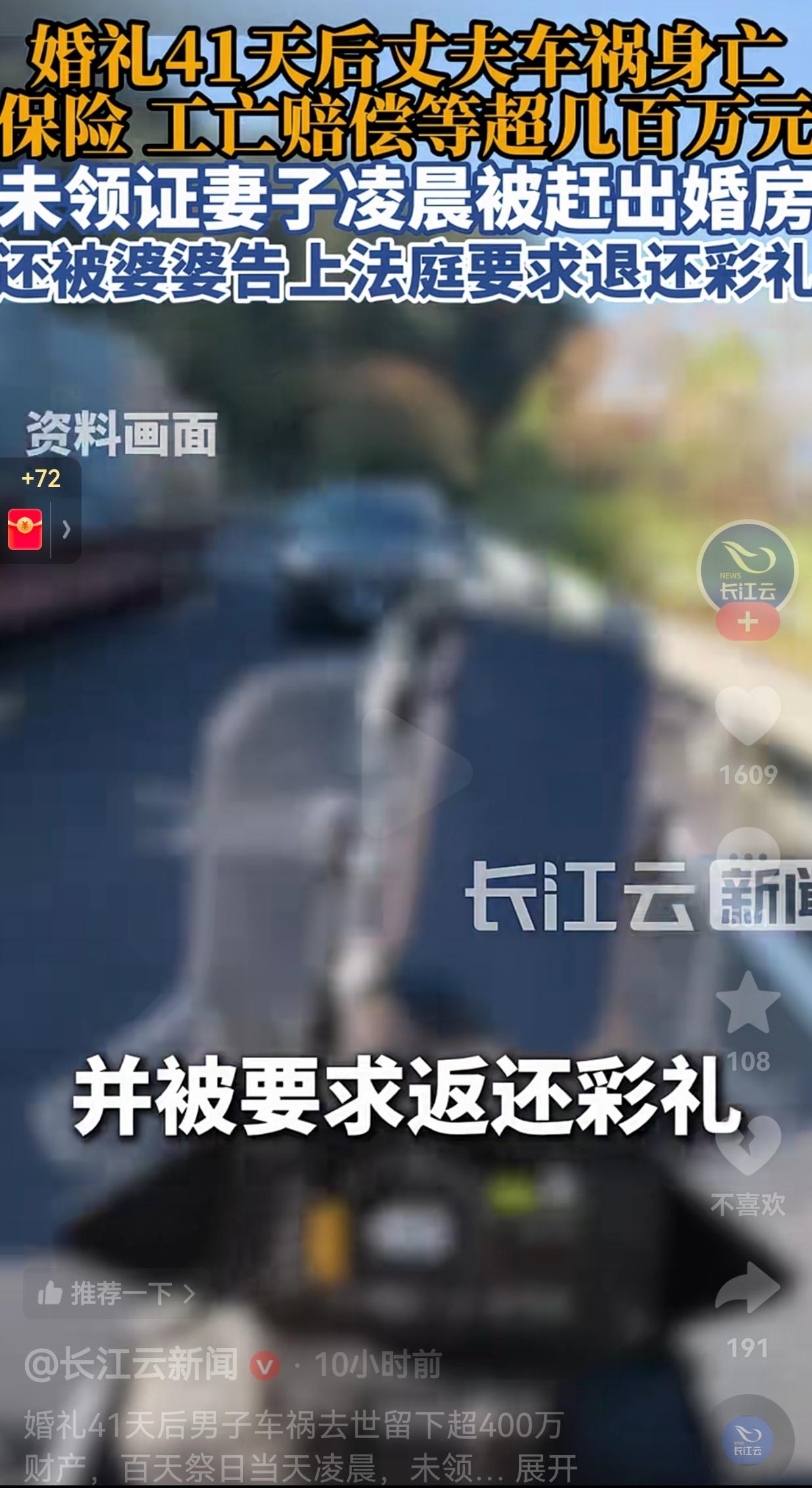 还是一张结婚证有效!山西朔州女子张晓与丈夫余涛,于2025年5月7日举办婚礼,但是,两人并没有扯结婚证。本以为两个人会幸福的过完一生,没想到的是,41天后,意外发生了,余涛因车祸去世。留下了保险、工亡赔偿等总计超过400万元的财产。 丈夫去世后,她以妻子的身份操办完丈夫的后事,提出分割部分财产的诉求,但因为缺乏法律上的依据而陷入困境。 2025年9月24日,是张晓的丈夫余涛的百天祭日。就在这天凌晨,她被婆家安排的四名男子强行闯入婚房,连人带行李被硬生生赶了出去。 婆家的人甚至当场就动手拆了墙上的结婚照,仿佛要把她存在过的痕迹,彻底从这个家里抹去。 这个可怜的女人,不仅要承受丧夫之痛,还没等从悲伤里走出来,就被婆家当成了外人。 张晓称,当时为了避免冲突,她只能选择默默离开。 更让人心寒的是,婆婆不仅不让她进门,还直接把她告上了法庭,要求她退还当初总计49.7万余元的彩礼。 面对婆家的无情,张晓也不再退让,她提起反诉,要求分割同居期间的共同财产及部分事故理赔款,索赔200余万元,其中包括余涛曾转给她的18.8万元转账记录。 可余涛的家属却倒打一耙,否认不愿补偿,反而声称张晓曾抱着遗像在村中诉苦,给家庭带来巨大压力,还指出张晓转走了余涛账户里约7万元的存款,并已就此另案起诉,试图把她塑造成一个“贪财闹事”的形象。 张晓想以妻子的身份,分割部分遗产,可因为两人只办了婚礼,没领结婚证,在法律上根本不被承认。 这就意味着,她守着的“妻子”名分,在400万的巨款面前,一文不值。 目前,双方涉及的三起诉讼案件均在审理中,等待法院最终裁决。 我看完这个故事,真的觉得后背发凉。 婚礼有多热闹,现实就有多讽刺。曾经的一家人,在钱的面前,说翻脸就翻脸。那个口口声声叫着“儿媳”的婆婆,在儿子尸骨未寒的时候,就急着把儿媳妇这个所谓的外人扫地出门,连最后一点体面都不给。 这也给所有姑娘提了个醒:爱情再甜,承诺再真,也抵不过一张结婚证的分量。 它不仅是仪式感,更是法律给你的保障。在人心和金钱的考验面前,只有法律能给你最后的安全感。 我们总说“一日夫妻百日恩”,可在这起事件里,百日的夫妻情分,终究还是败给了现实。张晓失去的不仅是丈夫,还有对人心的信任。 针对此事,你有什么看法呢?欢迎大家评论区讨论留言。 (信息来源:极目新闻)