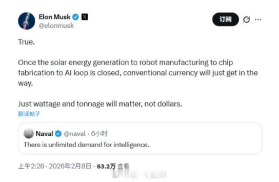 马斯克在X上表示“一旦太阳能发电、机器人制造、芯片制造、AI的整个闭环被打通,传统货币反而会成为障碍。真正重要的只剩下(发电)功率和产量——而不是美元” AI