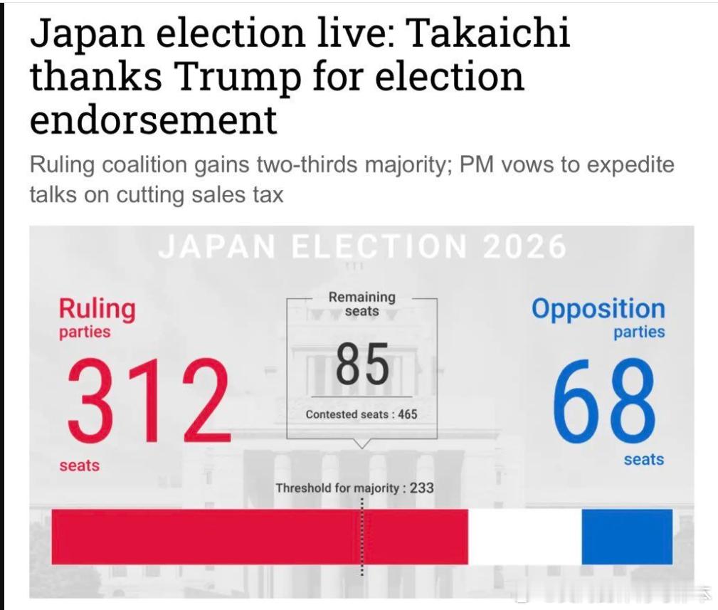 【黄金时代】日本保守派首相高市亮司以三分之二的多数席位赢得大选。