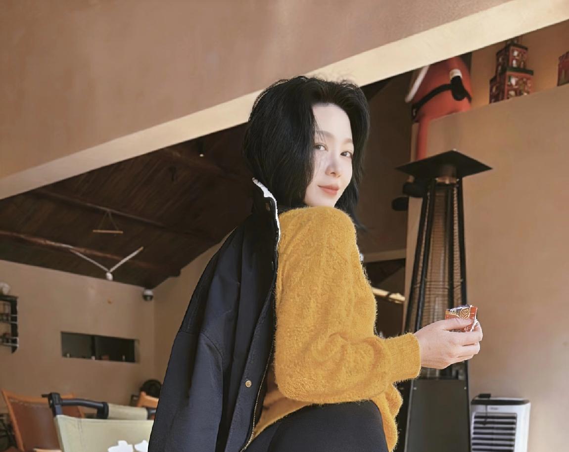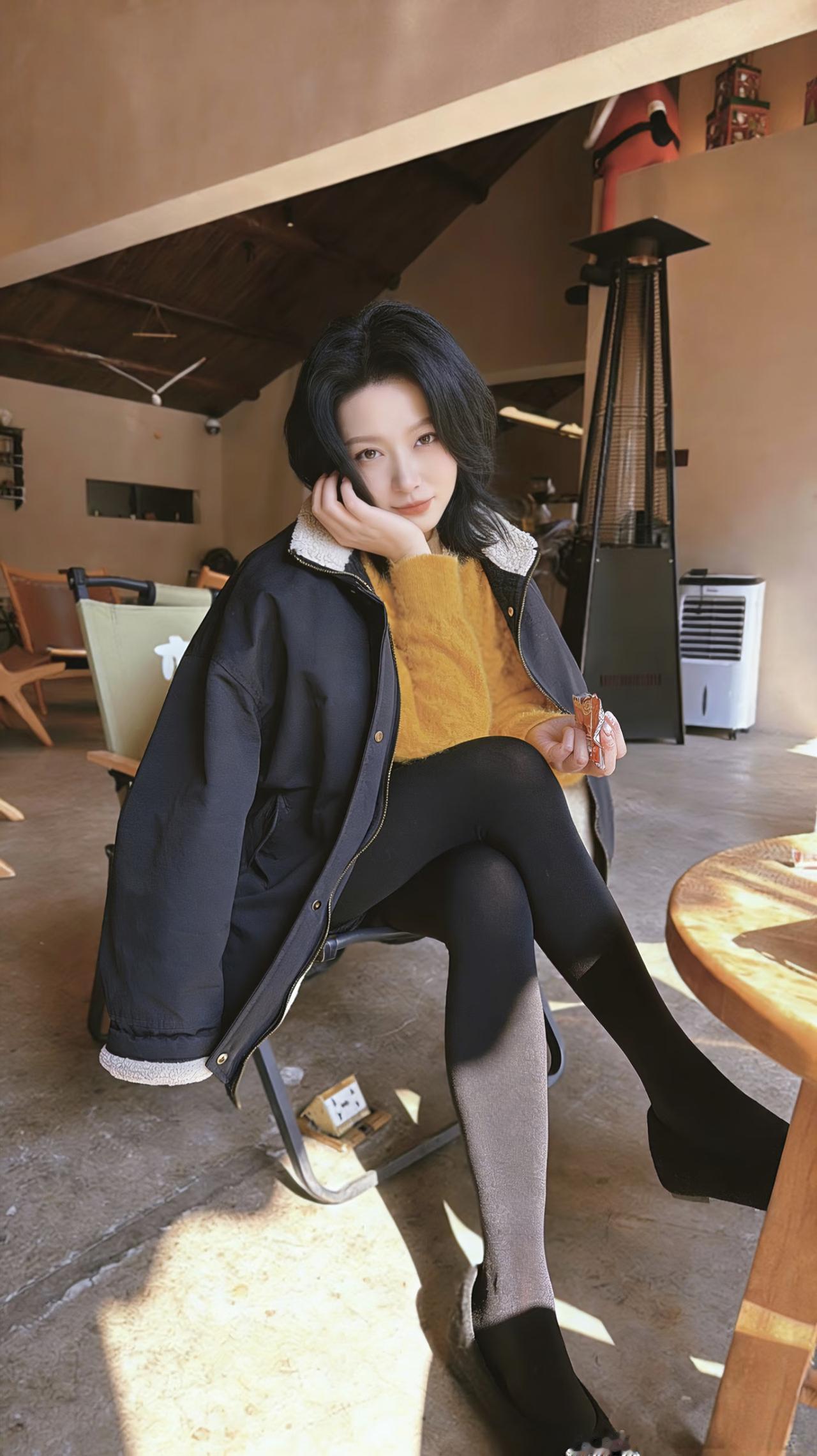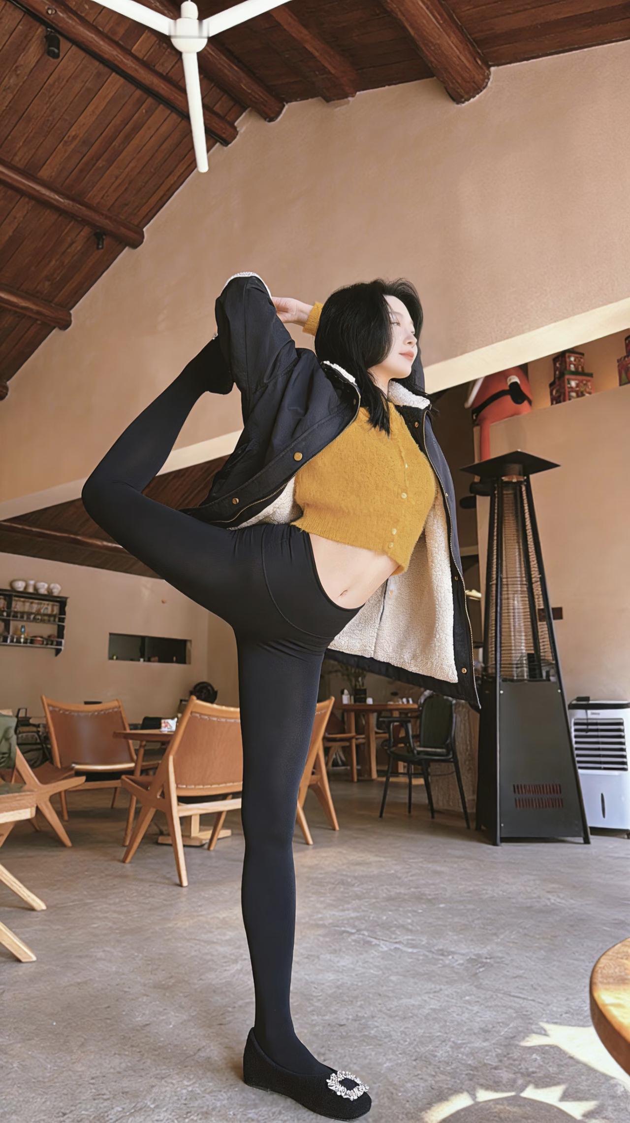 阳光洒进咖啡馆,温暖的黑发女孩展示一字马,好厉害👍🏻黑发女神 黑发辣妹