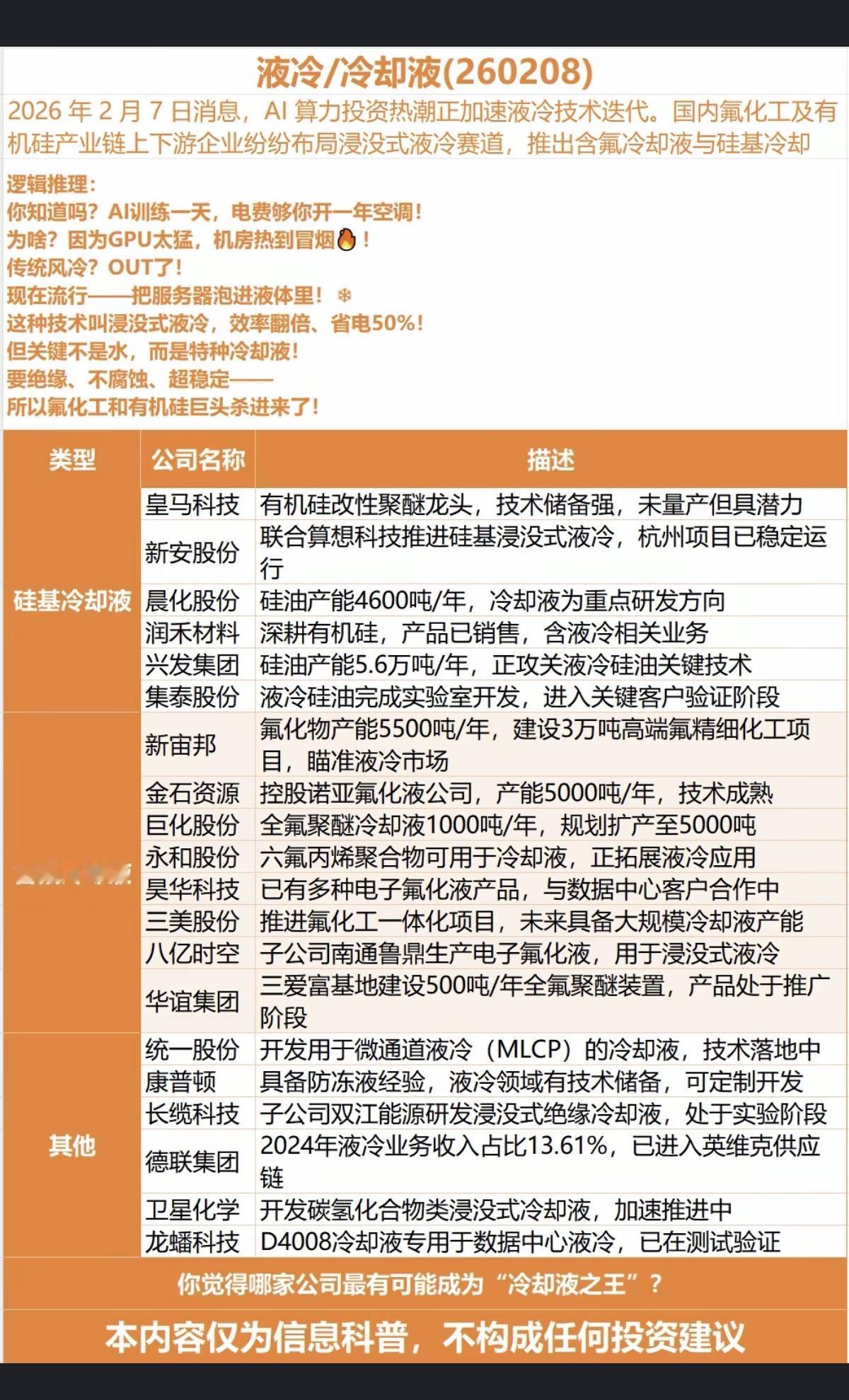 液冷/冷却液! AI算力投资热潮正加速液冷技术迭代! 国内氟化工及有机硅产业链上下游企业纷纷布局沉浸式液冷赛道,推出含氟冷却液与硅基冷却。 1.硅基冷却液 2.含氟冷却液 相关核心龙头股: