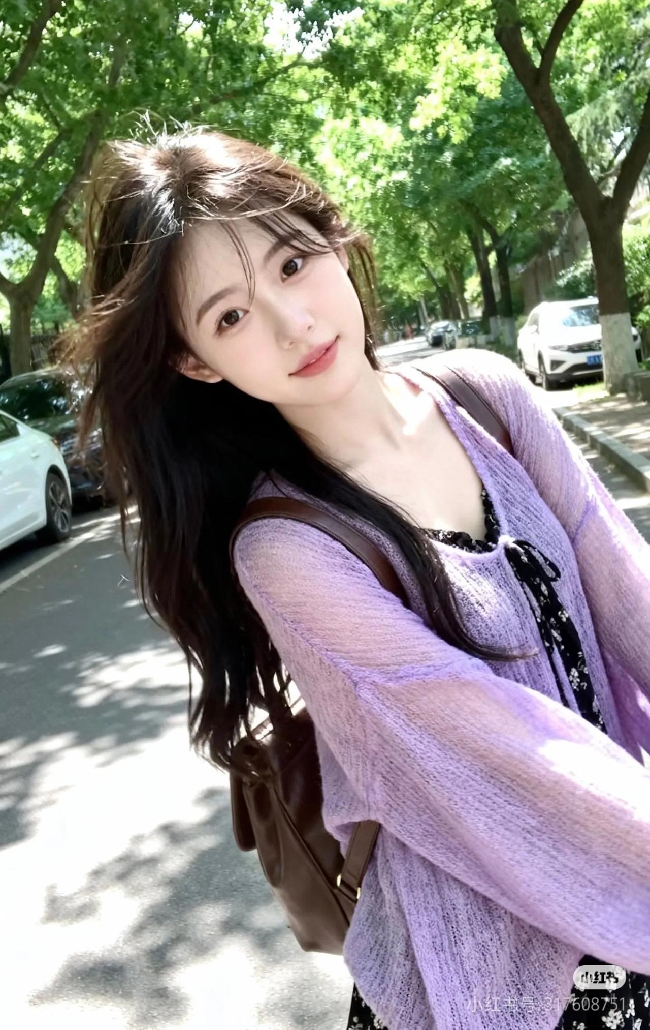 阳光下的甜美少女,紫色毛衣搭配黑色碎花裙,背着棕色包包,走在绿树成荫的街道上。街