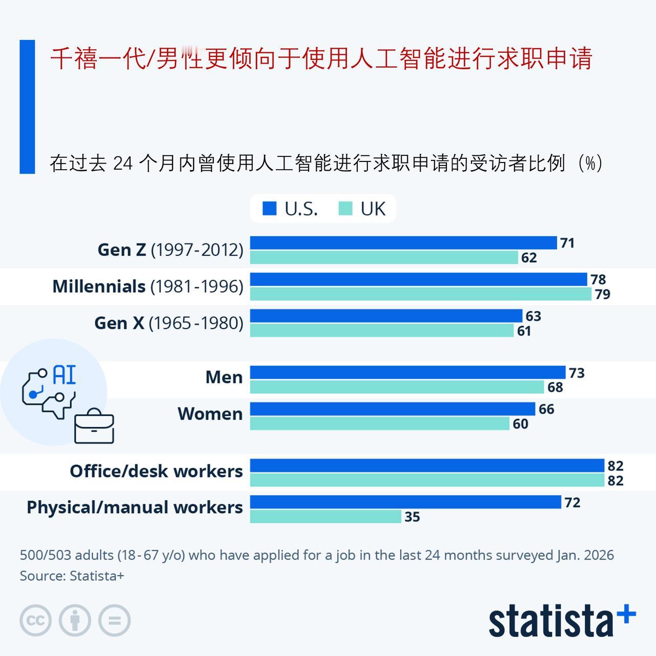 在求职申请中使用人工智能的情况有多普遍呢? 根据 Statista+ 的一项新调查,情况非常普遍。在 2026 年 1 月对美国 500 名成年人进行的调查中,70%的人表示在过去 24 个月内他们在求职时使用过人工智能;而在英国,这一比例为 64%。正如下面信息图表所示,人工智能的采用情况会因一些因素而略有不同,但似乎已成为常态而非例外。 在所有接受调查的年龄段中,千禧一代最有可能相信人工智能工具能够帮助他们申请工作:在美国这一比例为 78%,在英国为 79%,比其他年龄段高出几个百分点。男性在过去两年中使用人工智能进行申请的比例也略高于女性。报道中发现的最大差距出现在英国的办公室/办公桌工作人员与体力劳动者之间:前者中有 72%承认在申请过程中使用了人工智能,而后者这一比例仅为 35%。有趣的是,在美国,这一差距要小得多:分别为 82%和 72%。 虽然人工智能在美英两国似乎已被广泛用于求职搜索和申请工作,但人们仍存在担忧。在两国中,约有十分之六的受访者表示,求职者应谨慎使用人工智能,以免其被识别出来。那些近期未使用过该技术的人中,超过一半的人担心使用人工智能会导致申请过程中失去与人的直接交流。与此同时,大多数人都认为,未来若没有人工智能的帮助,求职将会变得难以操作。