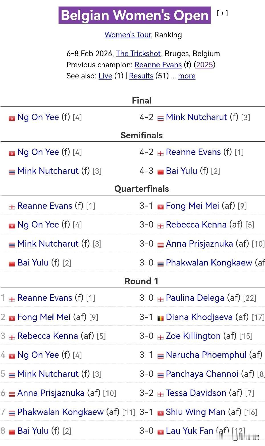 吴安仪击败闵克·努查鲁特 ,夺得斯诺克比利时女子公开赛冠军,白雨露半决赛负于努查鲁特。 比利时女子公开赛结束,吴安仪4-2击败闵克·努查鲁特(旺哈鲁泰),夺得冠军。 在之前的两场半决赛中,吴安仪4-2击败卫冕冠军埃文斯,努查鲁特4-3战胜白雨露。 比利时女子公开赛是排名赛,奖金很低,但积分目前不知道,此前获得WSF女子锦标赛冠军的白雨露刚刚超越努查鲁特来到积分榜第一,但两人的积分只差625分。 接下来的女子排名赛是3月27日进行的英国女子公开赛,预计白玉露、努查鲁特、吴安仪、埃文斯都会参加。 恭喜吴安仪!