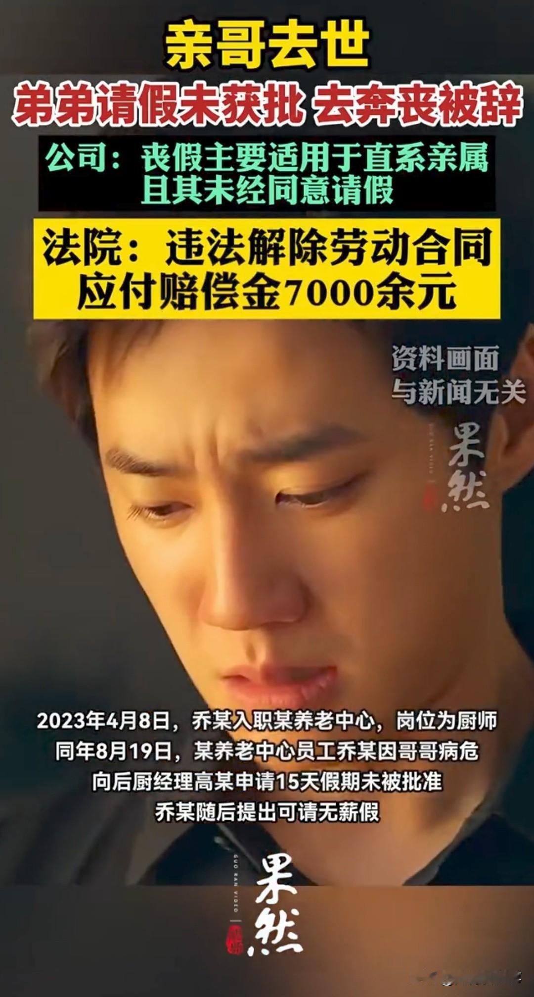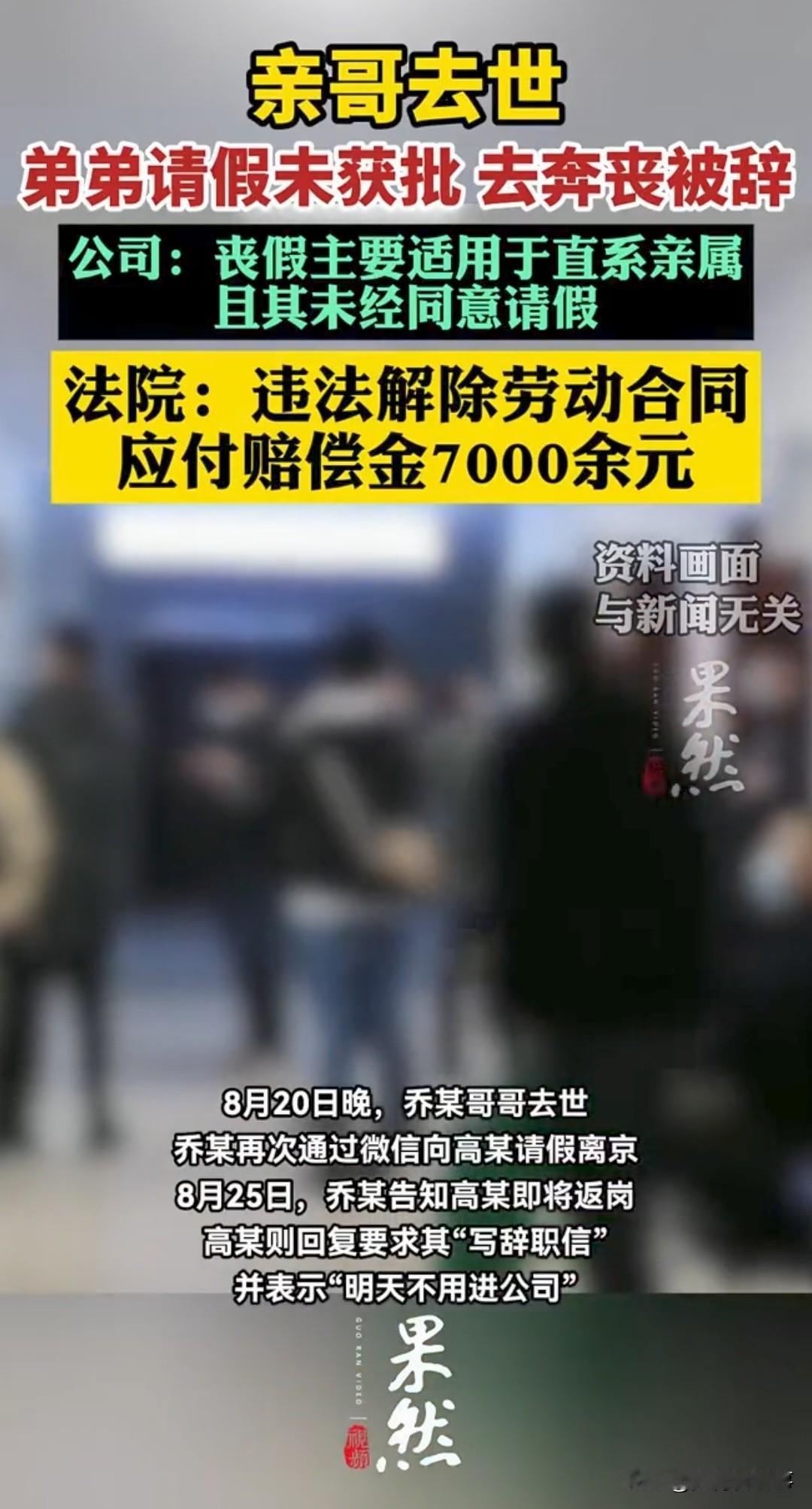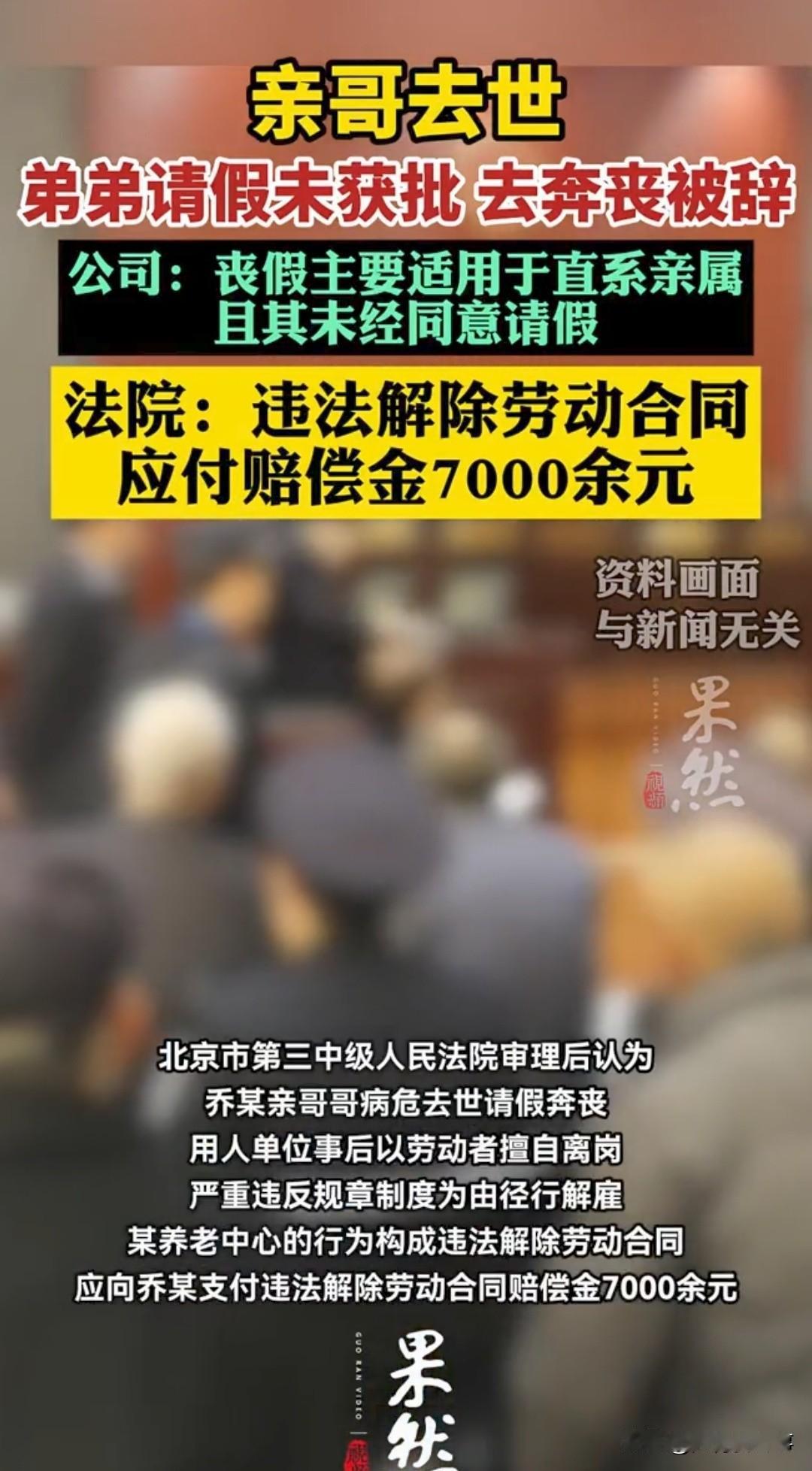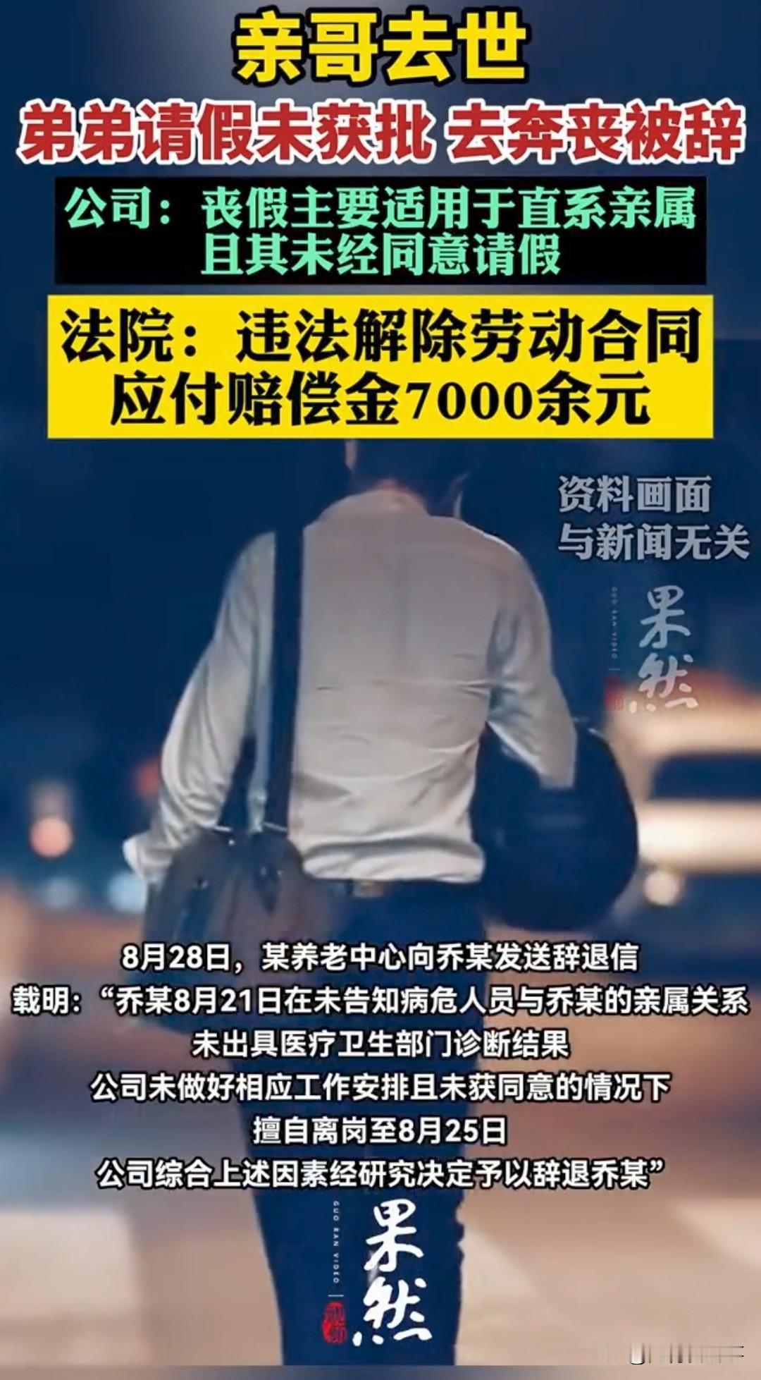 亲哥去世请假奔丧,公司不批还辞退!🔥法院终审判了 北京一厨师乔某,亲哥哥突发病危离世,他向公司申请无薪事假回家奔丧,多次申请均被无情驳回。 乔某无奈先行回家料理后事,返岗后直接被公司以“擅自离岗、严重违反规章制度”辞退。公司还狡辩:哥哥不属于法定丧假直系亲属,不批假合情合理。 这事闹上法庭,北京三中院终审判决来了: ✅ 公司辞退行为违法! ✅ 违背公序良俗与人伦底线! ✅ 需向乔某支付赔偿金7000余元! 法院明确:至亲离世奔丧是人之常情,企业管理权不能凌驾于人情道义之上。即便哥哥不在法定丧假范畴,员工的正当情感需求也应被尊重,不能用冰冷制度一刀切。 打工人必看:遇到家人重病、离世这类紧急情况,合理请假被拒,公司以此辞退属于违法!勇敢维权,法律站在我们这边! 你遇到过公司不近人情的请假规定吗?评论区聊聊你的经历~ 职场维权