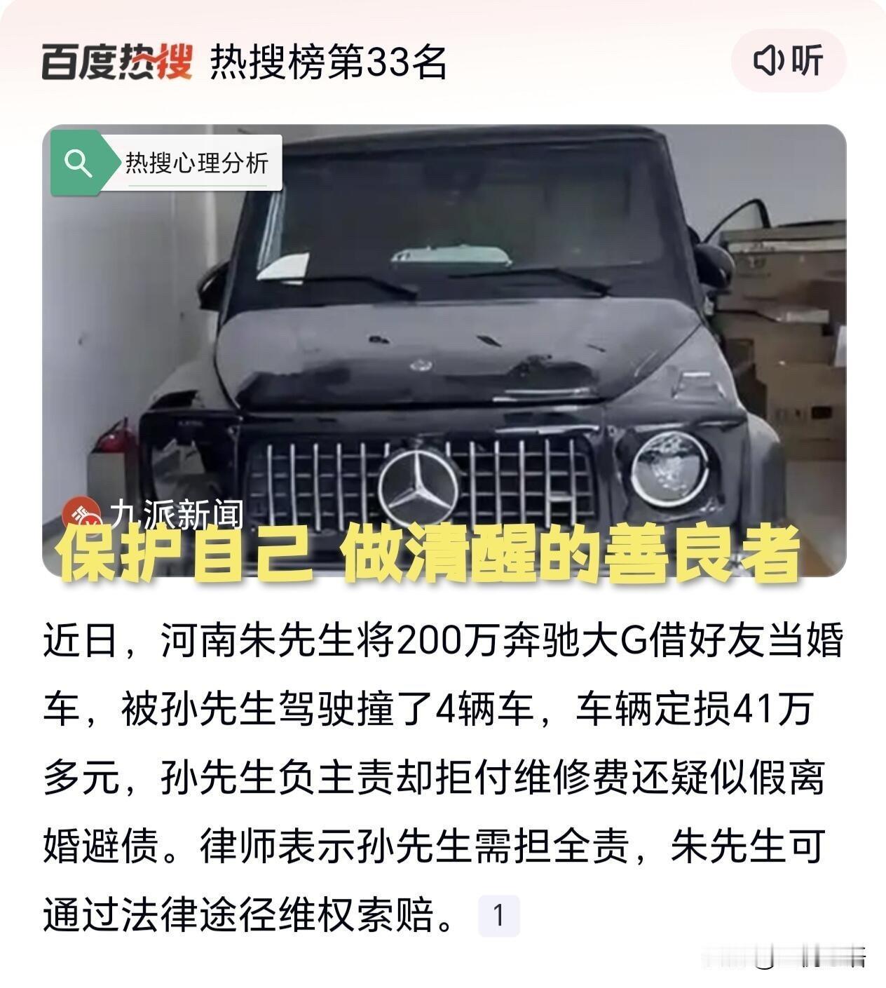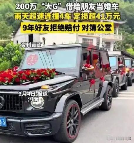 河南大哥心是真够大的,200万大G刚提车半年,就借9年好友当婚车。 结果婚礼当天,好友雨天超速连撞4车,定损超41万!更气人的是,对方疑似假离婚避责,一分钱都不想赔。(借车别人开,保险理赔也很难,真要借,连车带人一起帮忙最好) 真心换寒心,这事换谁都得膈应。再好的交情,谈钱谈利益也得有边界,车子女友这种贵重东西,千万别随便借。 话说大G4.0v8的机头,必须心存敬畏,能把2吨半的车跑出4秒+零百的动力,一般人真的毫无概念,这么说吧,市区道路,普通模式油门突然踩一半的程度,瞬间爆发的动力可以让30码瞬间冲到60以上,仅仅1秒+的时间,所以别天天听电瓶车说燃油机不行,德系大v8从来不是普通人可以想象的牛…… 善良从来都不是没底线,掏心掏肺的同时,也得守住自己的底线,不然最后受委屈的还是自己。