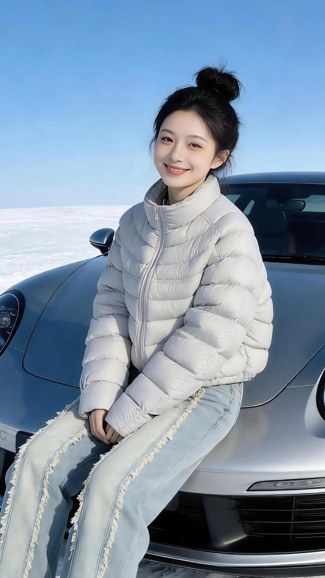 雪野飞驰 在被阳光晒得发亮的雪地上,银灰色的跑车像一匹蓄势待发的猎豹,而她就站在这匹猎豹的身旁,成了冬日里最鲜活的风景。 浅灰色的羽绒服裹着蓬松的暖意,细密的绗缝里凝着雪光,随着她抬手的动作轻轻起伏。牛仔裤侧缝的毛边在风中轻晃,像未化的霜花,为这一身利落的穿搭添上了几分随性。丸子头高高挽起,几缕碎发被风吹得贴在颈窝,是独属于少女的慵懒与俏皮。 她倚着车身歪头微笑,梨涡里盛着比雪后日头更暖的光。抬手比出心形的瞬间,寒风都仿佛被这笑意融化。跑车流畅的线条与她柔和的轮廓相映成趣,金属冷冽的光泽与羽绒服的温暖质感碰撞出奇妙的火花。原来速度与温柔从不是反义词,就像这雪野里的风和她,都让人忍不住想要奔赴。 高级感穿搭 冬季穿搭 新年穿搭 羽绒服