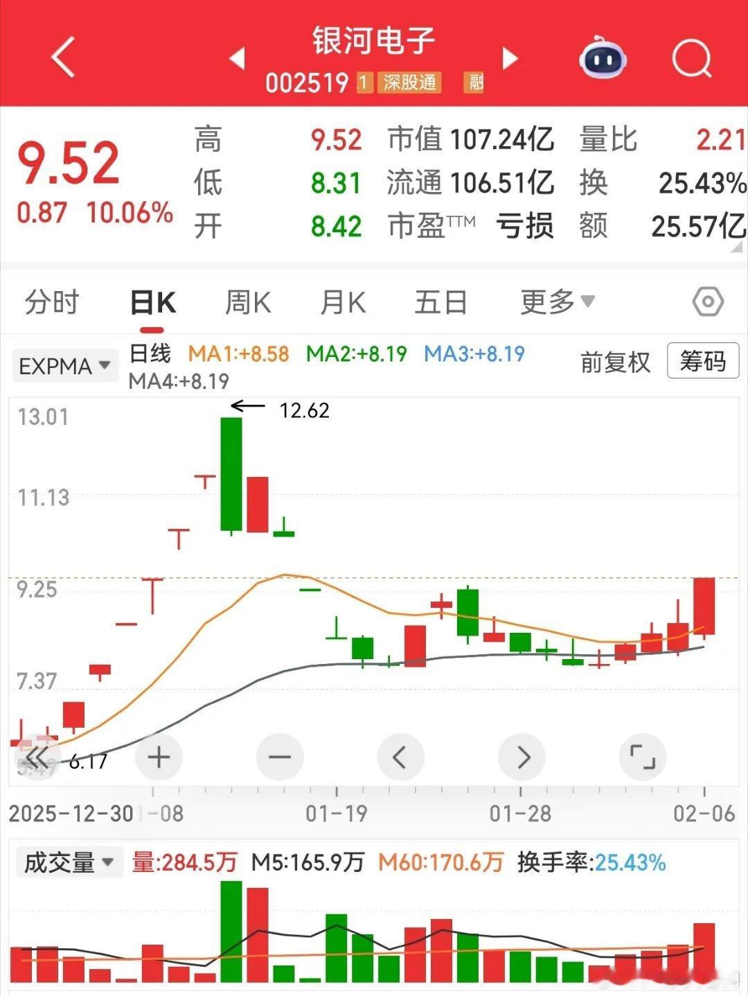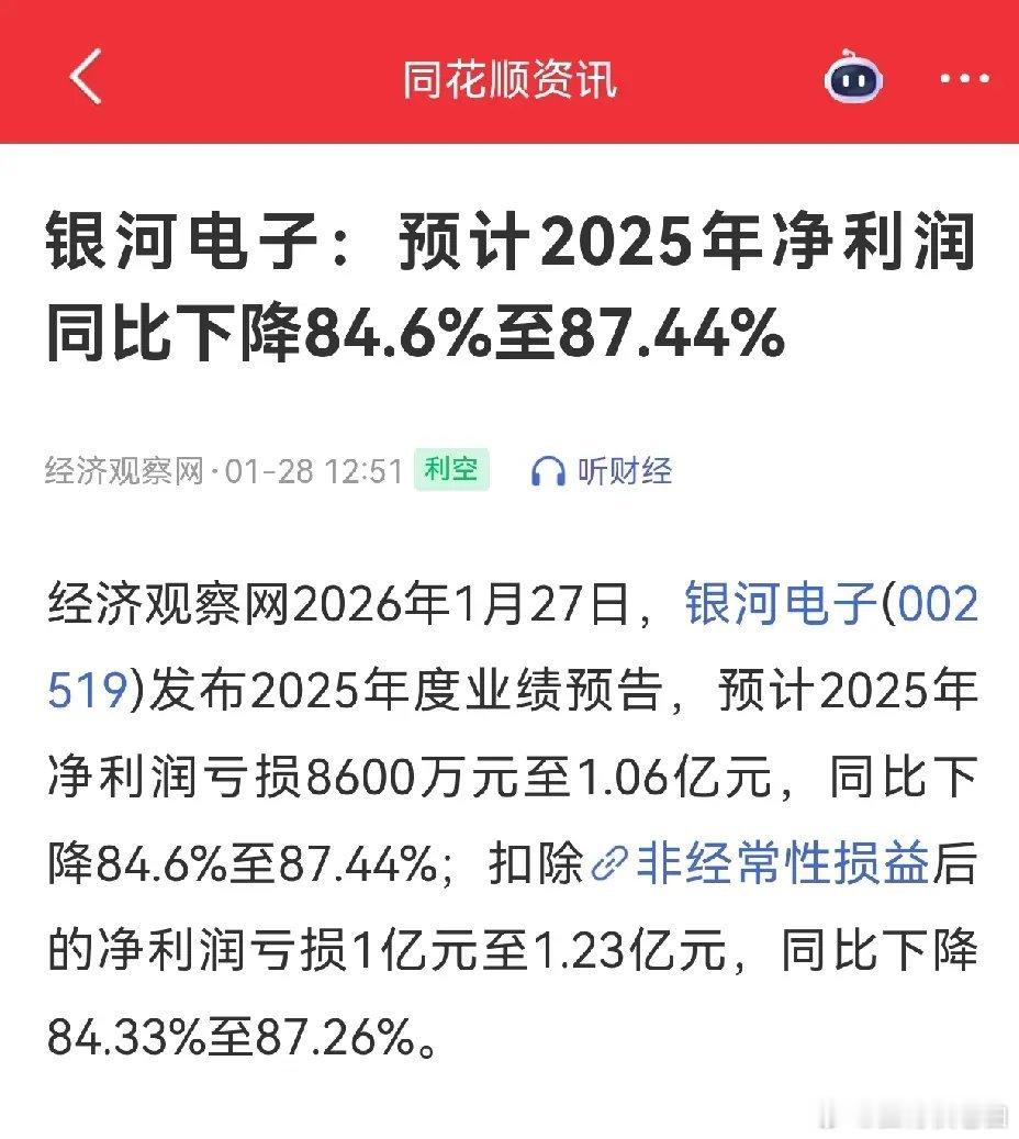 炒股,很多时候很矛盾的,业绩好的票,信心十足的拿着,总是不涨,一天两天,十天八天,真让人受不了,业绩差的,看都不想看,可是人家却涨得欢,一板两板三板四板,看得人心痒难耐。往往是等你忍受不了了,卖了绩优股,他就开始涨,买了亏损股他就开始跌。这是为什么呢?银河电子,预告2025年扣非净利润亏损1亿元以上,同比下降84%以上。特别提醒:贴图欣赏,并非推荐,据此操作,风险自担。✦✦✦本人仅此一号,不主动加人,主动加人者是骗子。请提高警惕,否则损失自负。✦✦✦