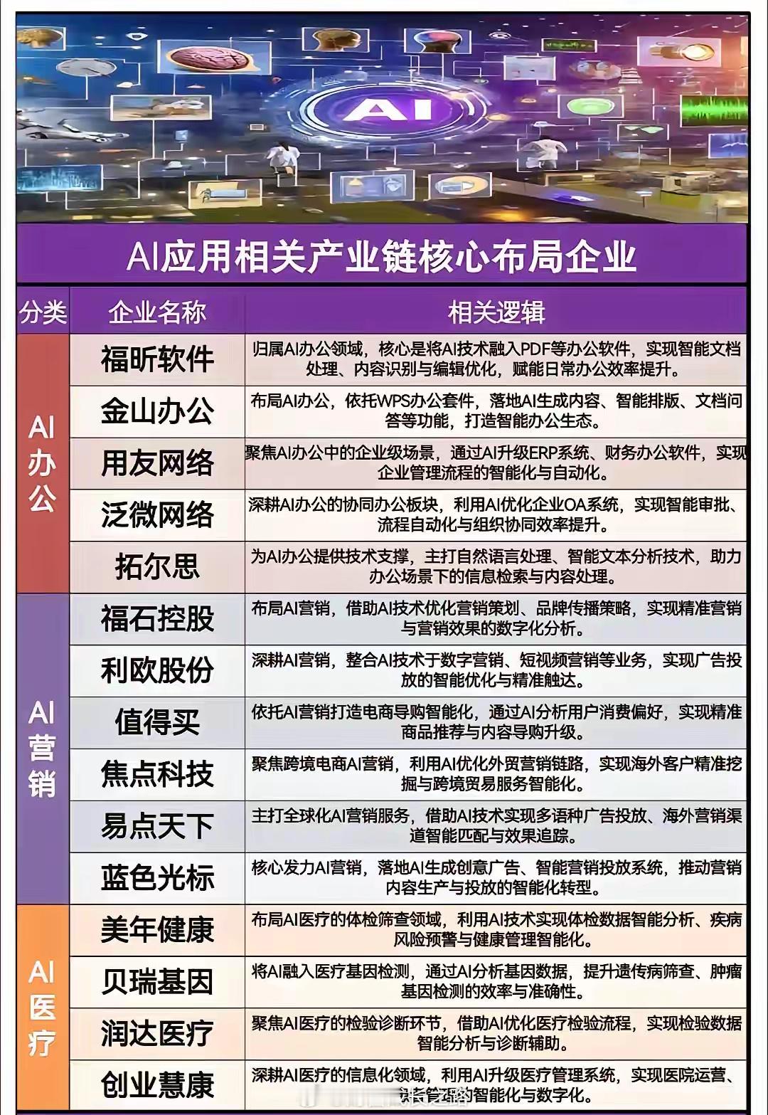 AI应用周末迎来重磅利好!全产业链核心龙头代表有哪些?从AI办公、营销、医疗,到文娱、政务、金融、教育、工业、智能体,八大细分赛道核心标的全覆盖,清晰拆解企业布局逻辑!(详细龙头名单见配图)