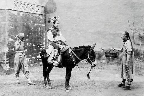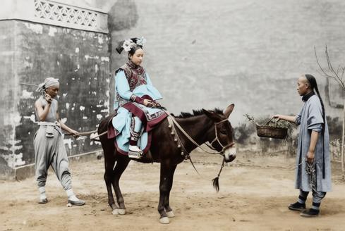 清末北京城内,骑驴是清末北京中产及以下旗人家庭女性最普遍的出行方式之一,既适配胡同狭窄的路况,又比乘轿更经济,是旗人家庭在特权衰落、经济下滑后的务实选择。 身后的佣人是旗人家庭常见的“使唤人”,多为同族贫苦旗人或汉族雇工,负责牵引毛驴、照料主人出行安全。