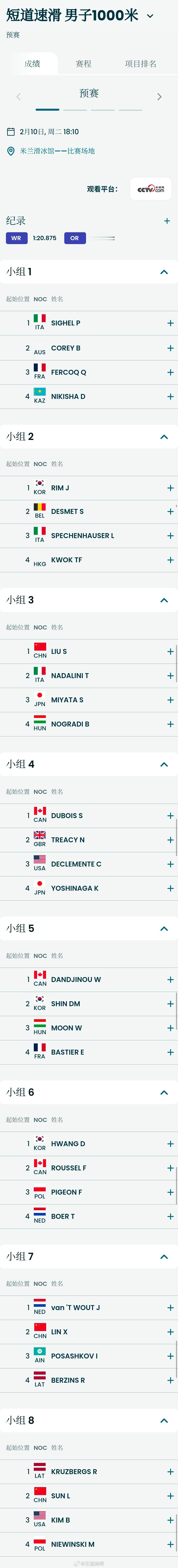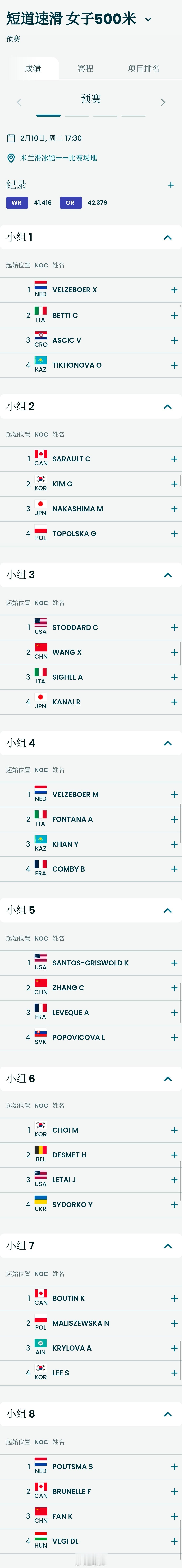 2026米兰冬奥会2月10日短道速滑中国队分组女子500米王欣然三组二道张楚桐五组二道范可新八组三道