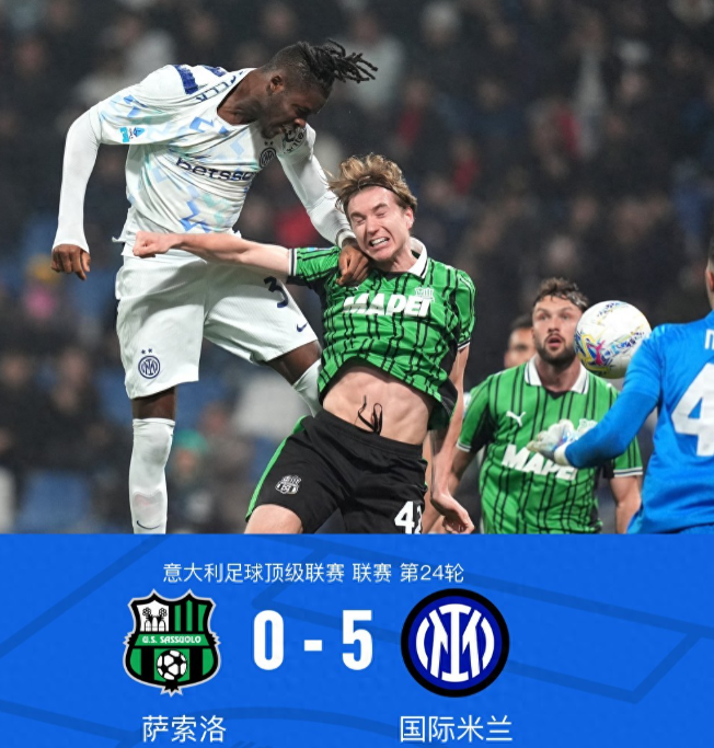 意大利足球甲级联赛第24轮,萨索洛主场迎战国际米兰。比赛上半场迪马尔科角球找到比塞克抢点头球破门先拔头筹,之后迪马尔科再送助攻,小图拉姆包抄垫射完成破门,劳里恩特越位在先,索尔茨维特的进球被吹无效。下半场劳塔罗禁区胸部停球后扫射破门,随后迪马尔科助攻帽子戏法,阿坎吉头球破门完成联赛首球,之后马蒂奇对裁判表达不满被两黄变一红罚下,比赛尾声路易斯-恩里克凌空抽射远角破门也攻入联赛首球。全场战罢,最终国际米兰客场5-0大胜萨索洛继续领跑积分榜。
