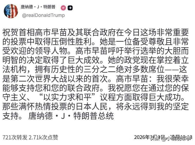 美国总统特朗普发文祝贺由首相高市早苗领导的日本自民党及其执政联盟赢得了2月8日举行的众议院选举。 看起来,特朗普为此感到高兴,因为他与高市早苗在白宫的会晤可如期举行了(3月19日两国领导人将举行会晤)。