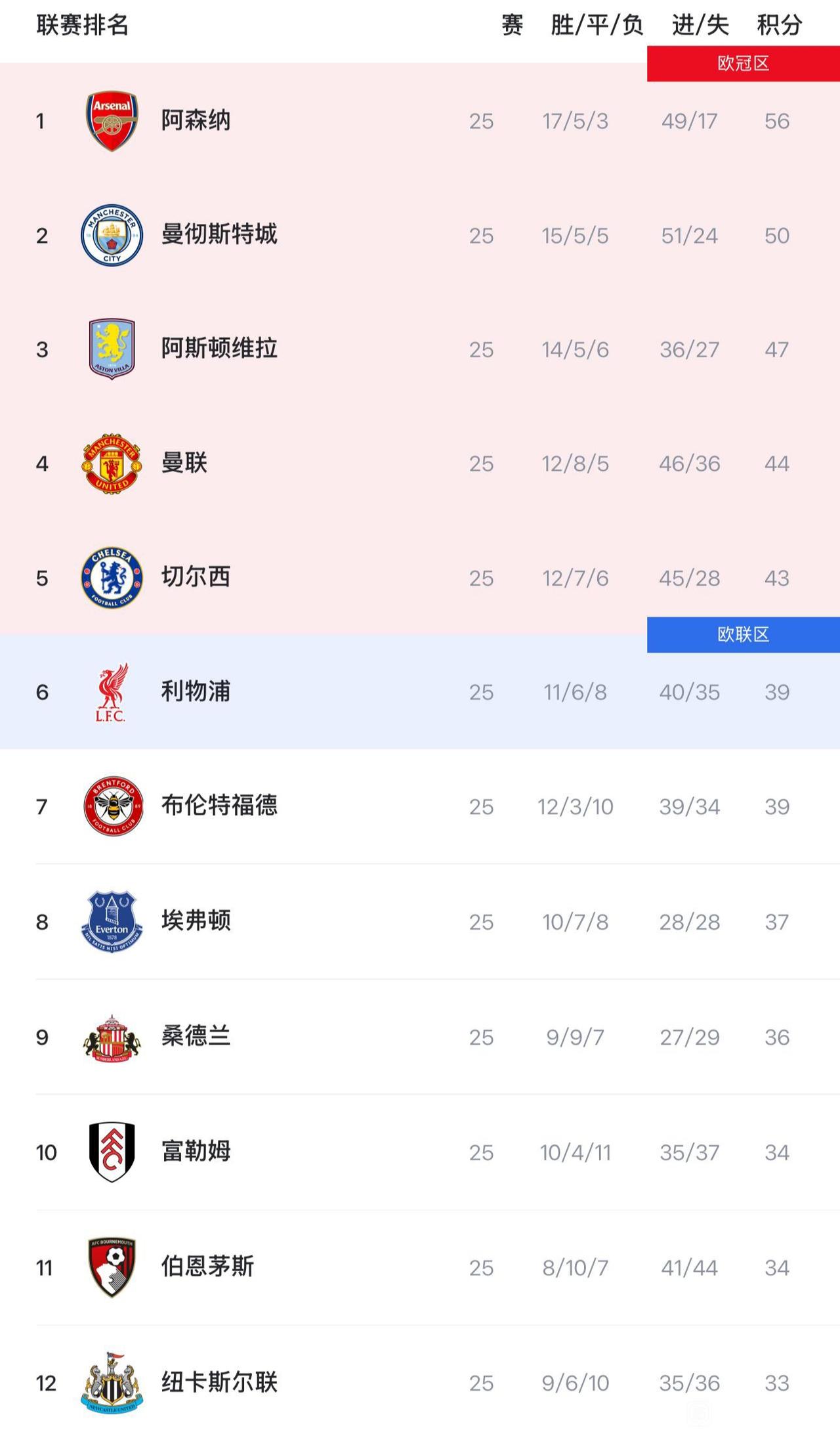 最新英超积分榜,最绝望的是利物浦球迷。 阿森纳领先6分,梦想越来越近。 曼城斩落利物浦,还有希望逆转。 维拉表现超出预期,欧冠资格就行。 曼联大发神威,都敢喊夺冠了。 切尔西保持第五,已经领先利物浦4分。 甚至利物浦球迷觉得欧联杯都不一定了,斯洛特下课是共识??[震惊]
