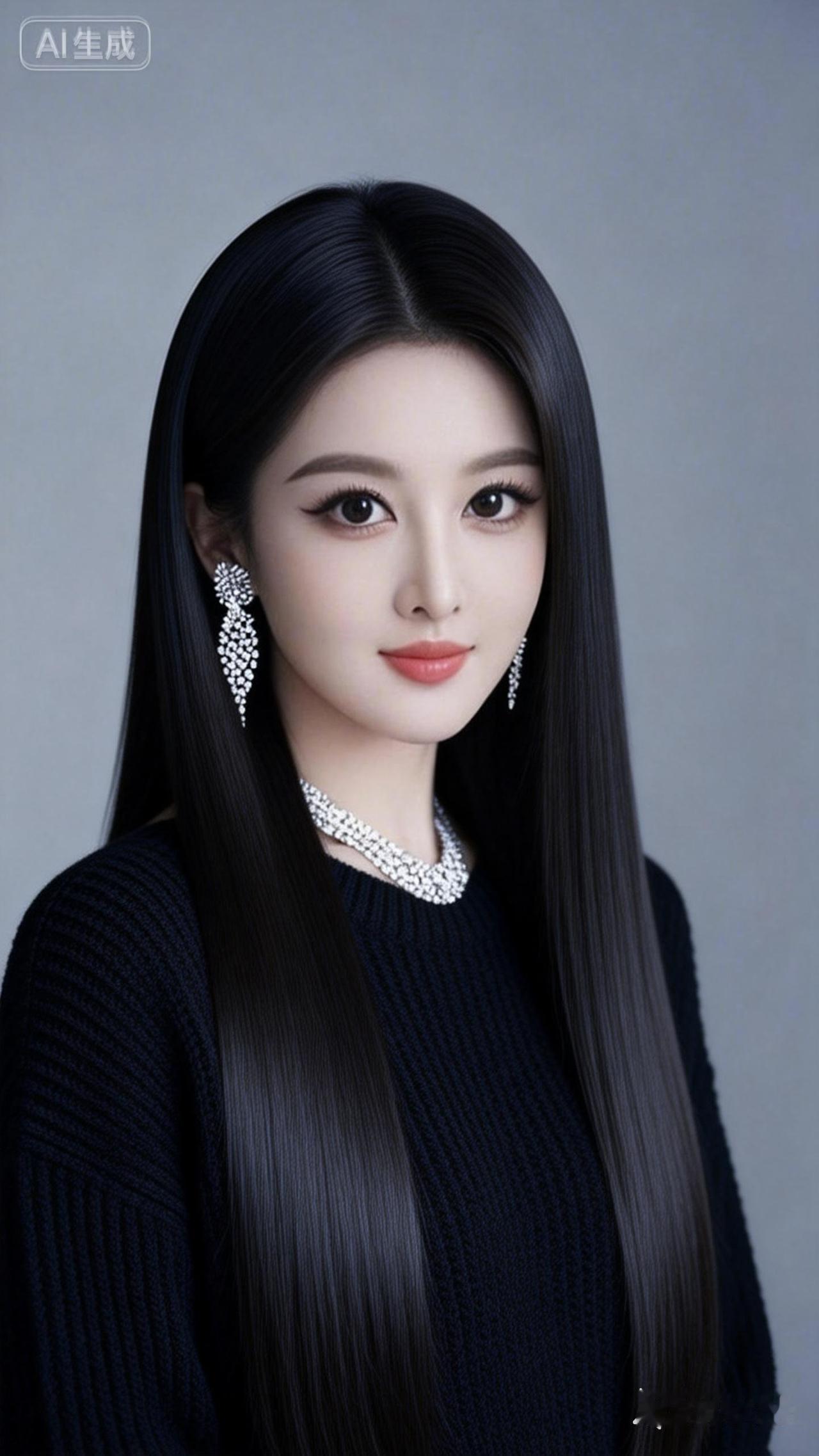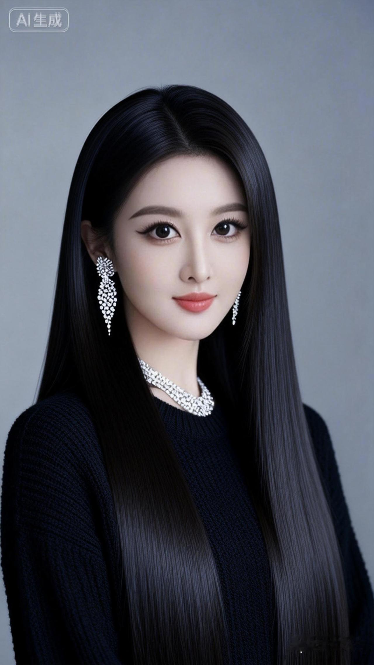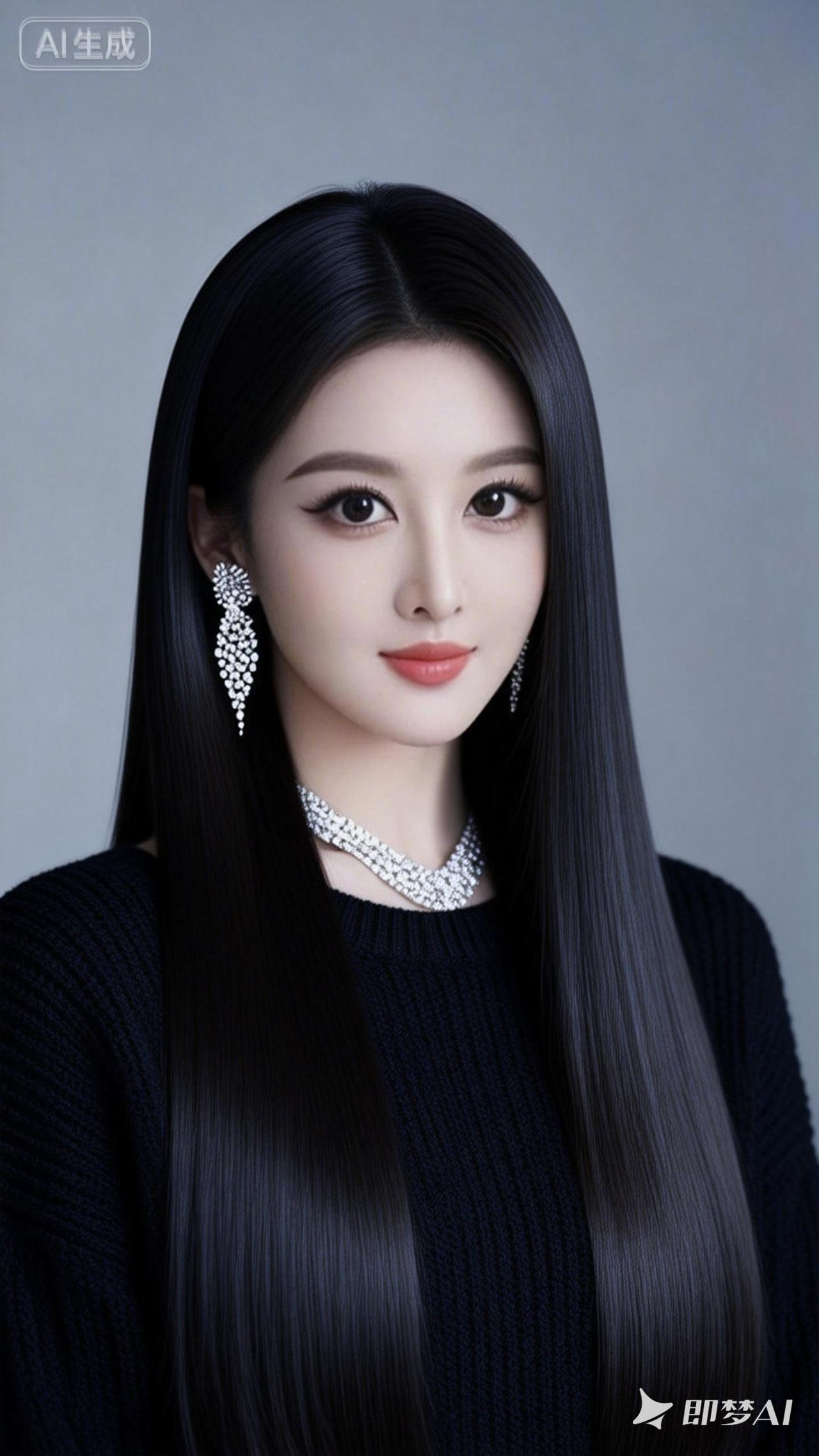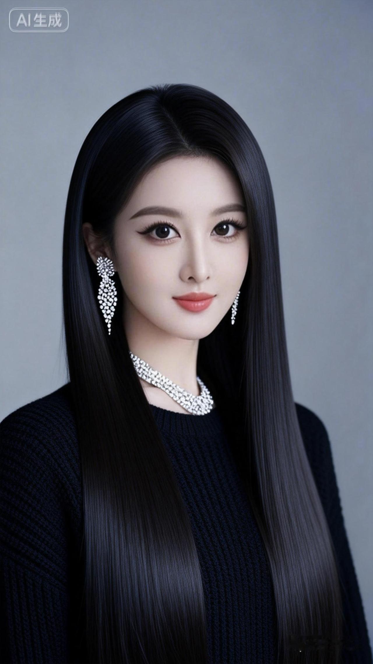 一位年轻女性的肖像。她有着长长的乌黑、浓密、顺滑、齐整、极长如缎子般丝滑垂坠的直发,发丝顺滑,非常有光泽