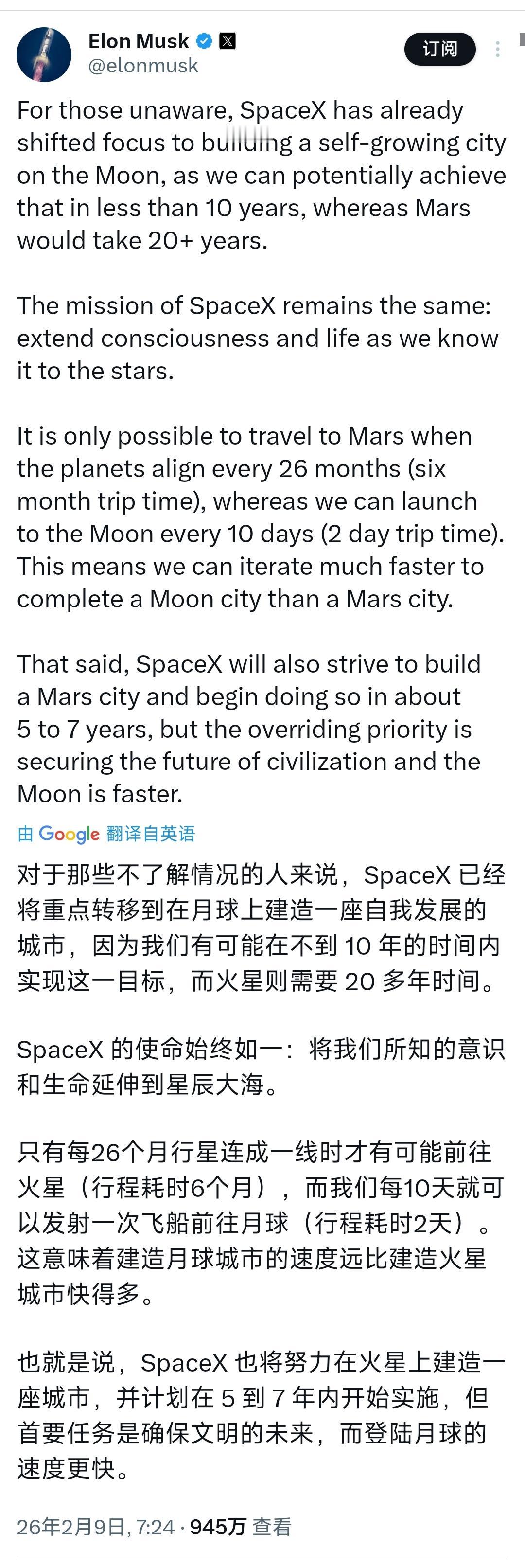 埃隆·马斯克今天(北京时间2月9日)阐述了他的月球城市计划:“对于那些不了解情况的人来说,SpaceX已经将重点转移到在月球上建造一座自我发展的城市,因为我们有可能在不到10年的时间内实现这一目标,而火星则需要20多年时间。 SpaceX的使命始终如一:将我们所知的意识和生命延伸到星辰大海。 只有每26个月行星连成一线时才有可能前往火星(行程耗时6个月),而我们每10天就可以发射一次飞船前往月球(行程耗时2天)。这意味着建造月球城市的速度远比建造火星城市快得多。 也就是说,SpaceX也将努力在火星上建造一座城市,并计划在5到7年内开始实施,但首要任务是确保文明的未来,而登陆月球的速度更快。” [机智]评几句:埃隆·马斯克是一位极具影响力且充满争议的跨界先锋。他兼具理想主义与科学精神,既有着殖民火星月球、推动清洁能源普及等宏大而富有前瞻性的理想,又凭借扎实的科学素养和工程能力,通过SpaceX的可回收火箭技术、特斯拉的电池技术等创新成果,将理想逐步照进现实。他从互联网领域的PayPal创业起步,却始终将目光聚焦于实业前沿,在新能源、航天、脑机接口等多个领域持续深耕,以工程师的务实态度打破行业壁垒,为人类科技进步做出了不可忽视的贡献。