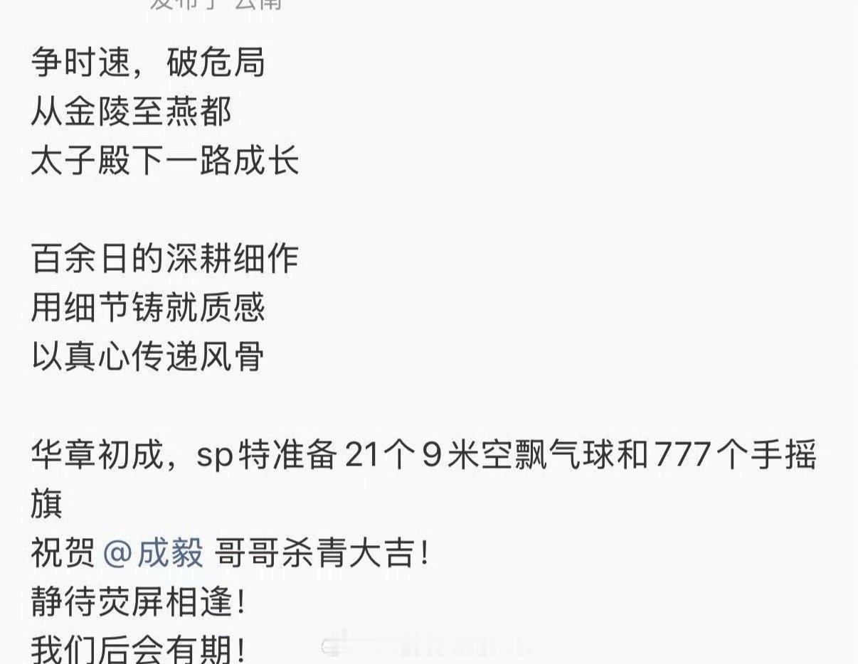 成毅两京十五日粉丝杀青应援成毅《两京十五日》的杀青应援来了,粉丝为成毅准备的应援排面,谁看了都会羡慕啊!21个9米空飘气球,和777个手摇旗,陪着偶像一同走花路,期待成毅新剧早日开播了!成毅两京十五日杀青应援排面