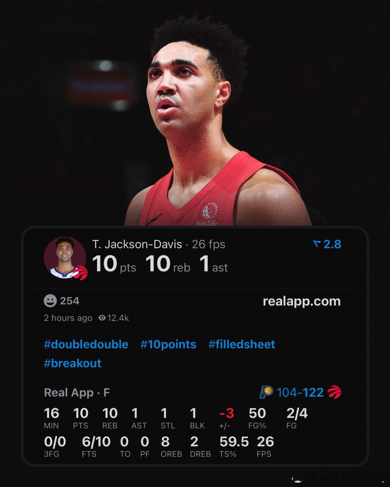 特雷西·杰克逊-戴维斯猛龙首秀:10分10个篮板(8个进攻篮板)1助攻1抢断1盖帽,10罚6中。