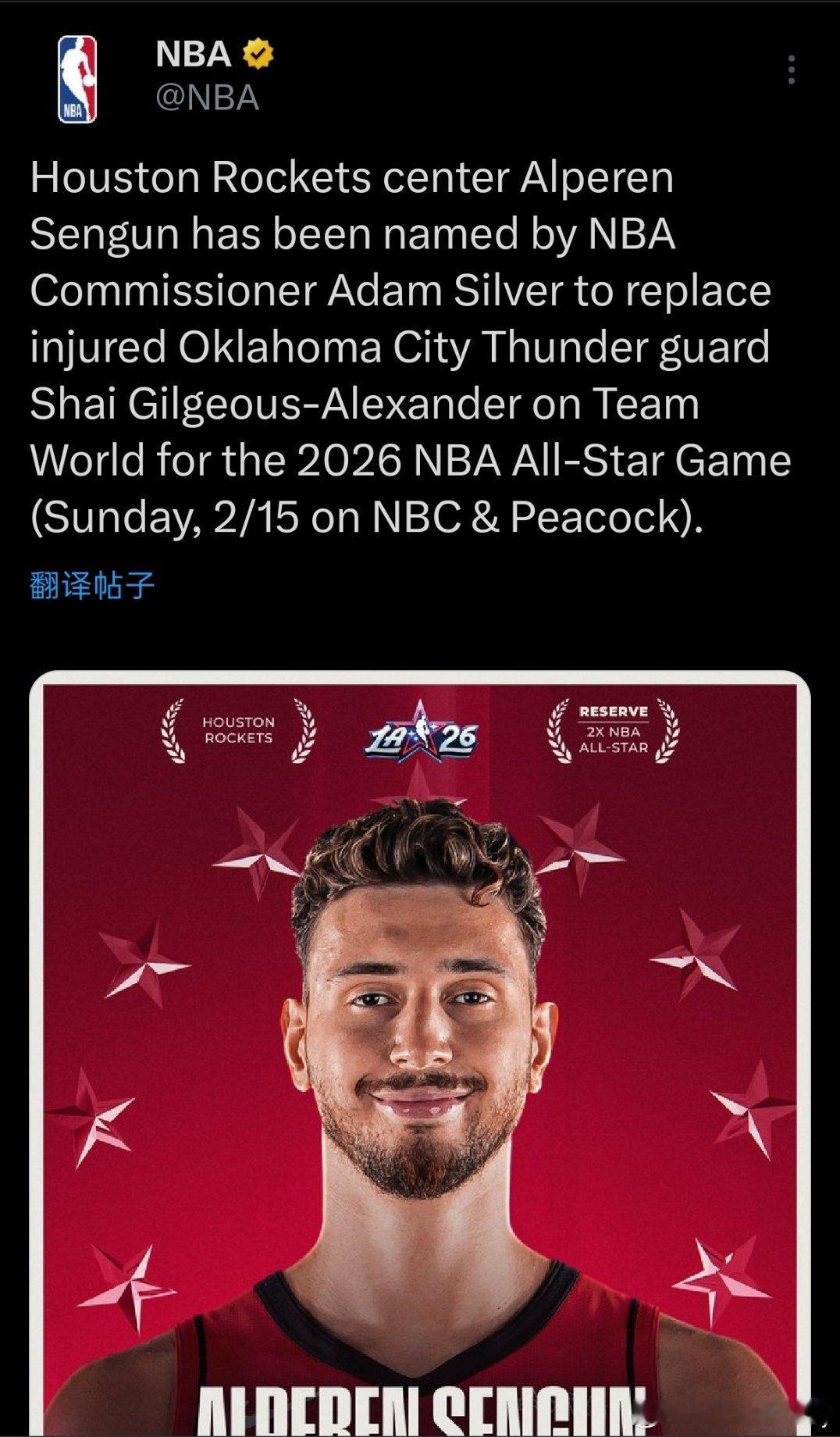 申京顶替受伤的亚历山大入选全明星,加入世界队。