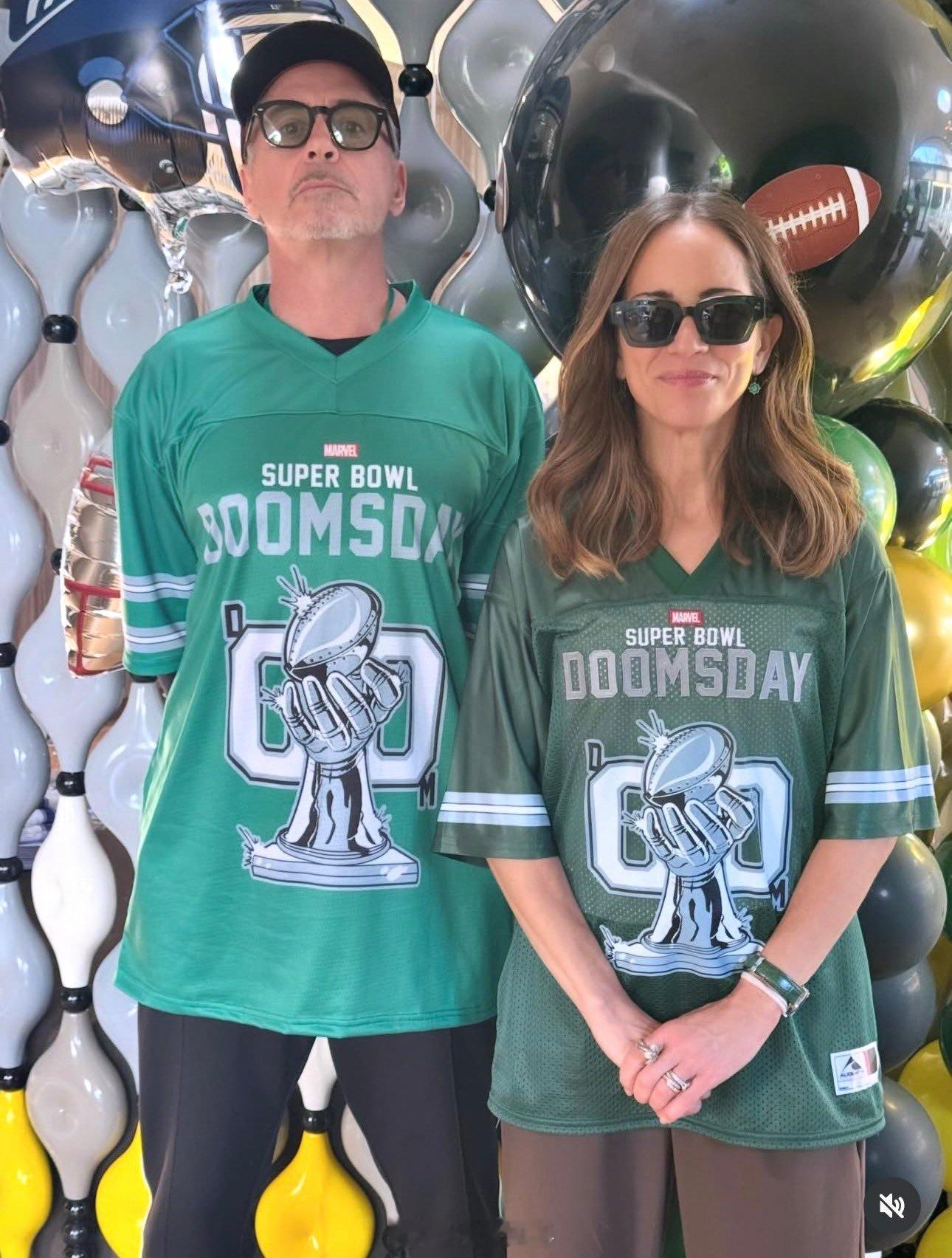 傲娇老唐分享和太太身穿《复仇者联盟:毁灭日》 超级碗球衣的照片。
