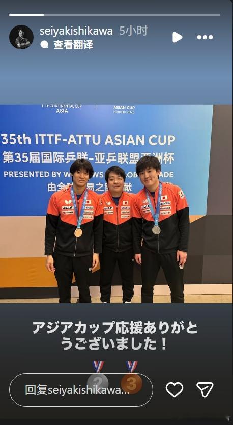 ITTF亚洲杯26张本智和 260209 岸川教练ins快拍 晒和银牌张本铜牌户上的合影“感谢您对亚洲杯的支持!”(机翻)cr:seiyakishikawa