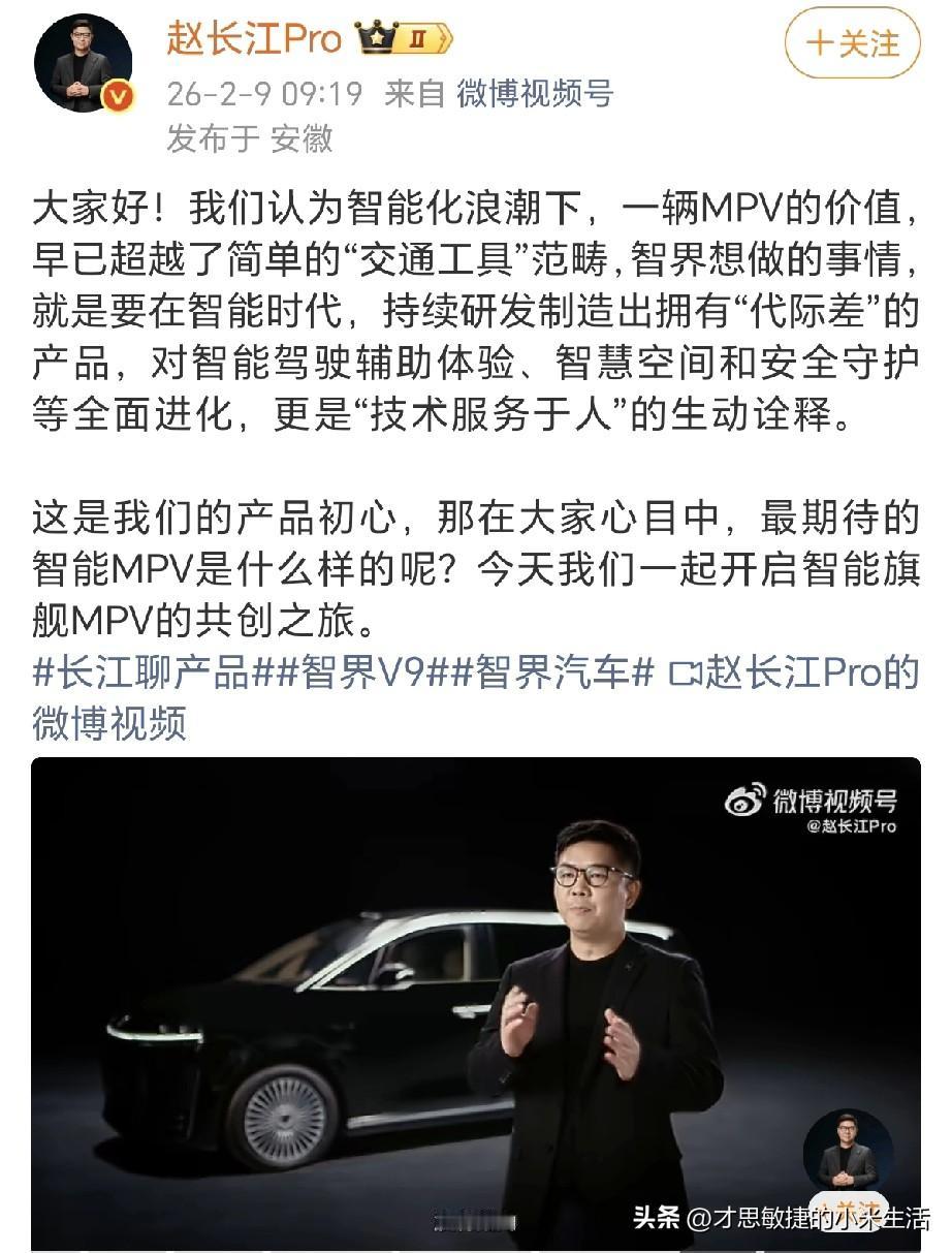 赵长江谈智界V9:空间是MPV的灵魂!在智界V9里,没有配角。 智界赵长江今天发视频聊鸿蒙智行首款MPV,智界V9。 赵总在视频里说今天的MPV市场看起来很热闹,真正的突破却不多,思路还停在过去。 赵总表示智界想做的事情,就是要在智能时代,持续研发制造出拥有“代际差”的产品。在V9里没有配角,每一个位置都是为重要的人而设计的。 咱有一说一,智界V9这个外观我觉得很简洁大气不张扬,颜值耐看,是兼顾家用与商务的低调豪华之选。当高端MPV的竞争还停留在堆砌冰箱彩电时,智界V9这套旋转座椅的设计,确实让人眼前一亮又一亮。它不只是增加了两个可转动的座位,而是真正思考了车内空间的多种可能性——从商务对谈到家庭互动,一个简单的旋转就能切换场景。这比单纯增加屏幕尺寸或皮质用料要高明得多,你们觉得呢?