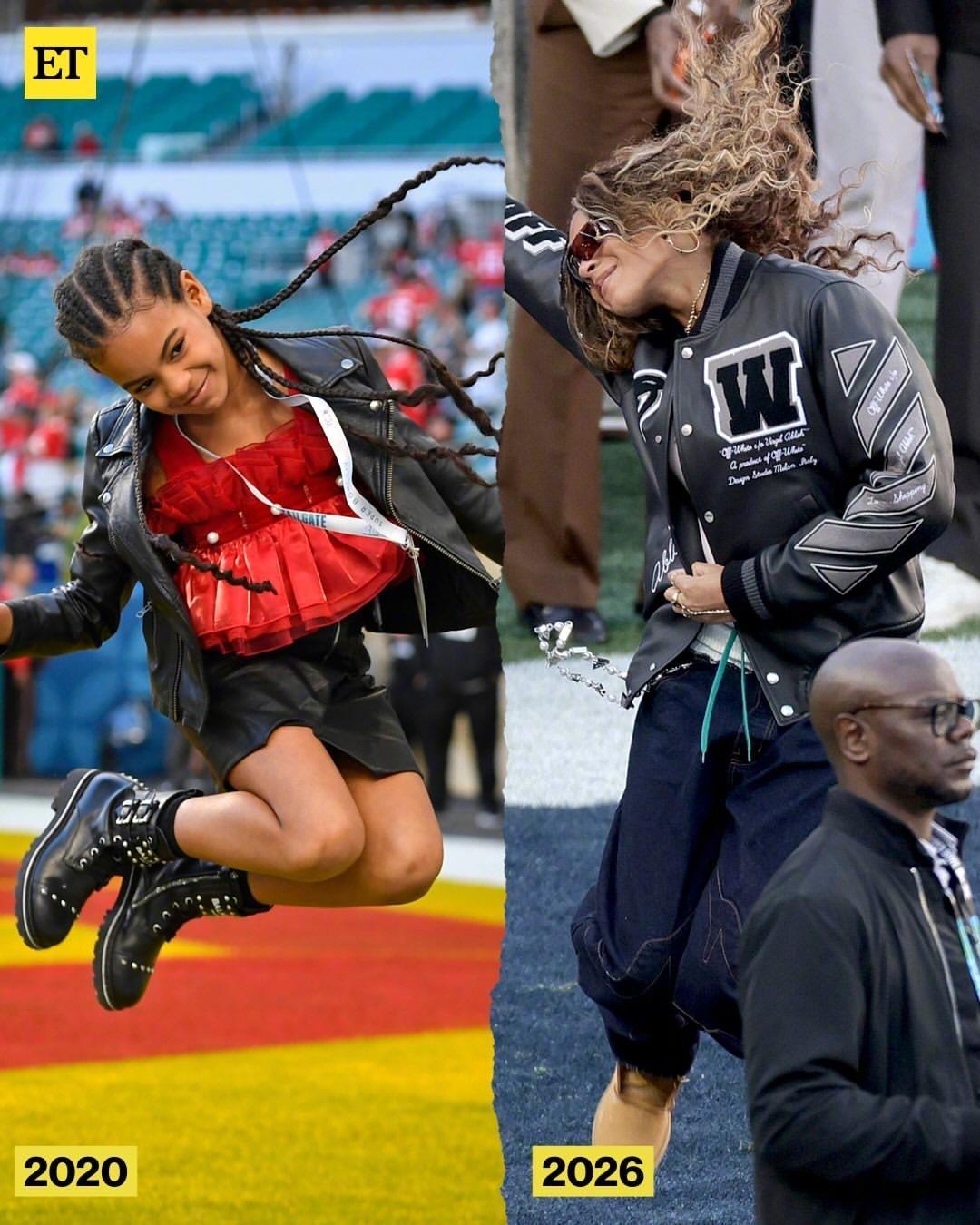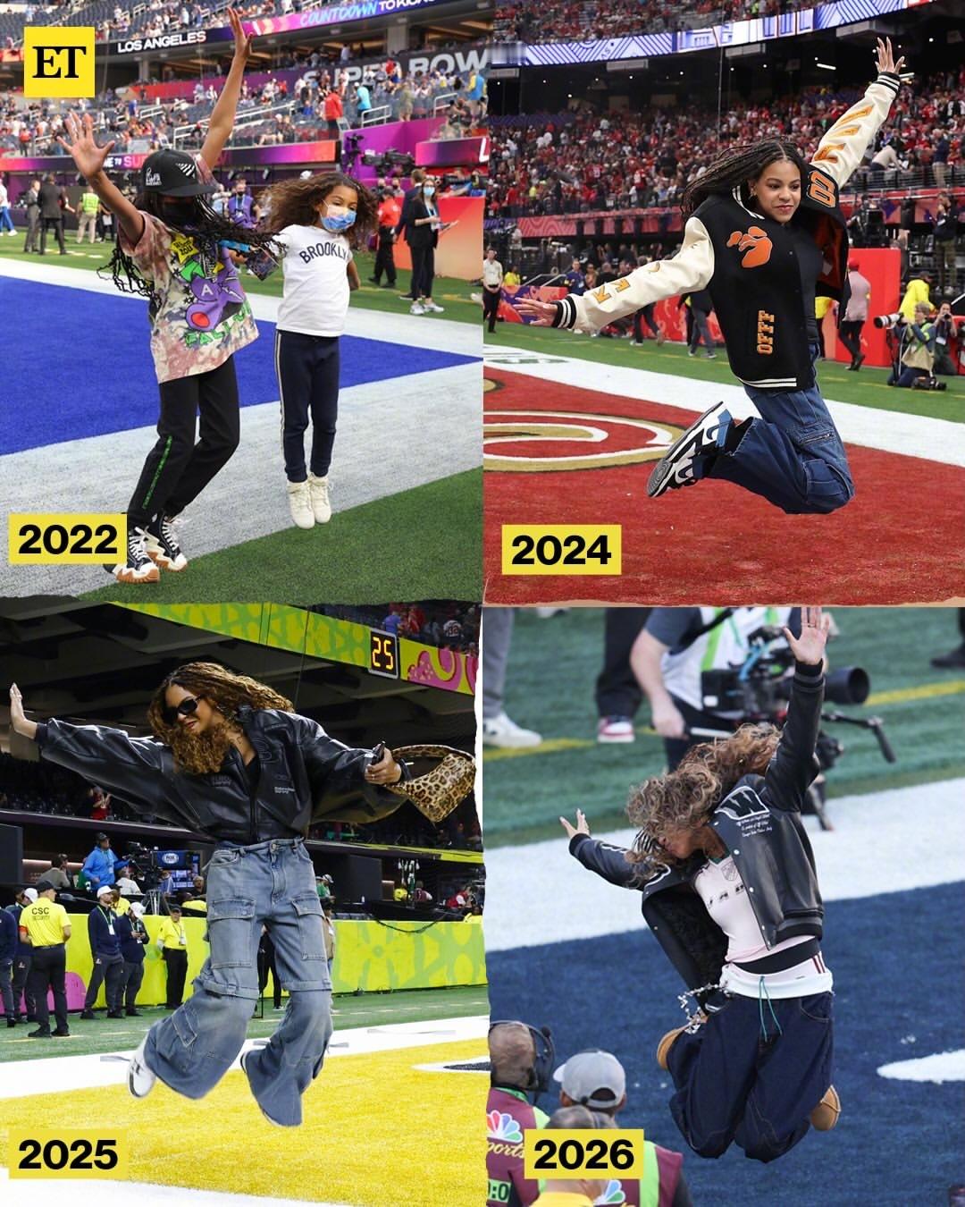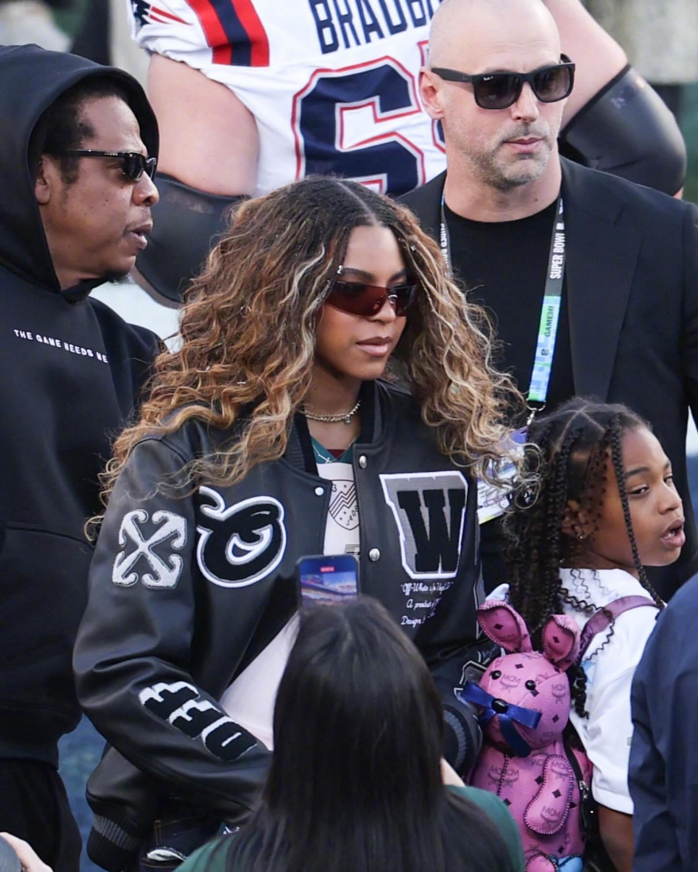 Jay-Z 正携 14 岁大女儿 Blue Ivy Carter、小女儿Rumi 一起出席 2026 年超级碗!这蓝厅长猛一看以为碧昂丝,身穿 Off-White 夹克,手拎 Balenciaga ,还来了个她的经典“超级碗跳跃”,妹妹Rumi也加入了。米拉服饰解析