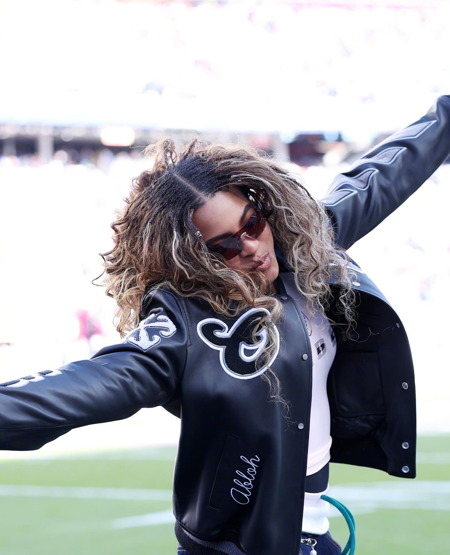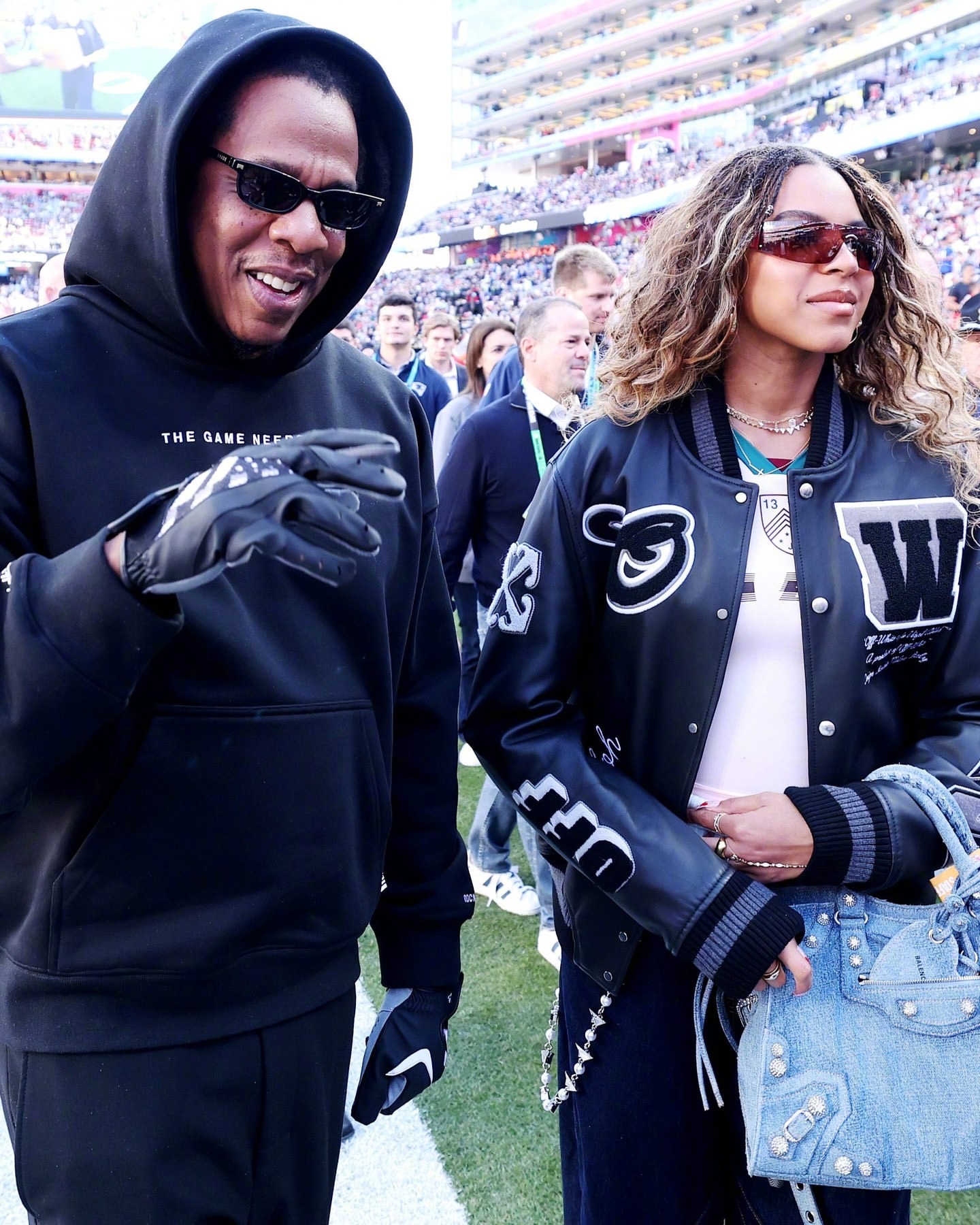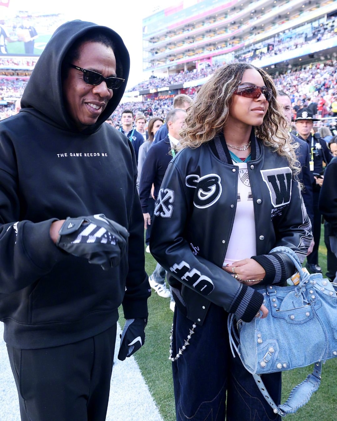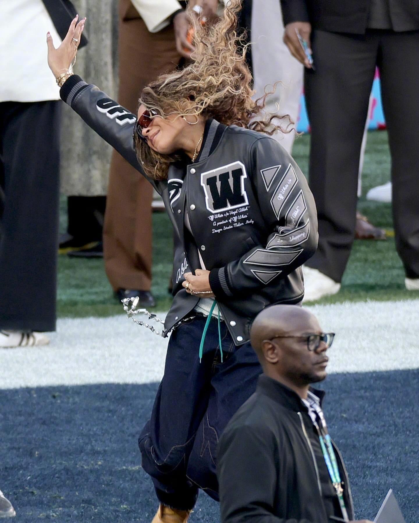 Jay-Z 正携 14 岁大女儿 Blue Ivy Carter、小女儿Rumi 一起出席 2026 年超级碗!这蓝厅长猛一看以为碧昂丝,身穿 Off-White 夹克,手拎 Balenciaga ,还来了个她的经典“超级碗跳跃”,妹妹Rumi也加入了。米拉服饰解析