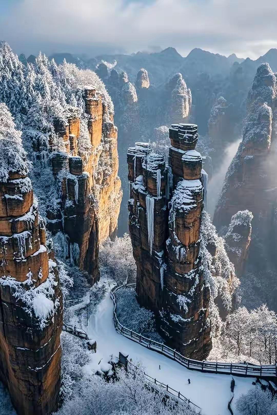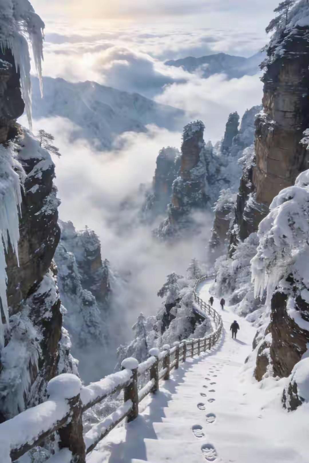大雪过后的张家界长啥样? 日前的一场大雪,好像给张家界被施了魔法,变成一幅绝美的冰雪画卷。 峰林覆雪。平日里棱角分明的石英砂岩峰林,此刻都披上了一层厚厚的银装。雪层在阳光的照射下,与裸露的赭色岩壁交相辉映,勾勒出冷峻又圣洁的轮廓。 冰瀑垂悬。悬崖峭壁上,无数晶莹剔透的冰瀑如白玉雕琢的帘幕,从高处垂落,层层叠叠,在寒风中凝固成绝美的雕塑。 云海翻涌。山谷间的云海在雪后更加浓郁,如棉絮般在峰林间翻涌,将一座座孤峰托举在云端,宛如仙境。 栈道蜿蜒。山间的木质栈道被白雪覆盖,蜿蜒在悬崖边缘,行人的脚印在雪地上延伸,为这片静谧冰雪世界增添了人间烟火。 光影交织。当阳光穿透云层,洒在雪顶和冰瀑上,折射出耀眼的光芒,让整个世界都变得晶莹剔透,仿佛置身于一个冰雪琉璃的童话世界。 这是大自然用冰雪为张家界重新绘制的杰作,每一处都美得让人屏息。 (文陈士健 图百度)