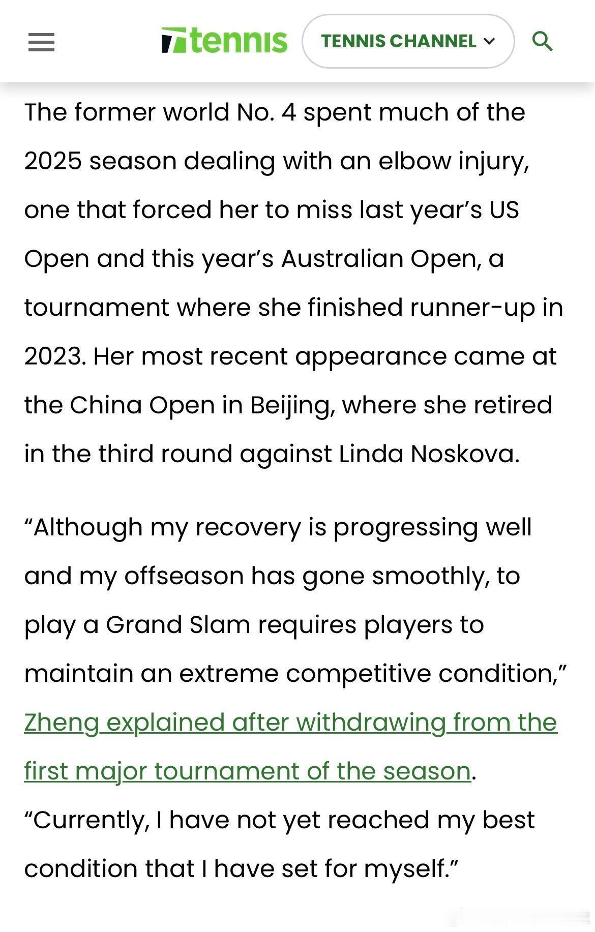 郑钦文说:“尽管康复进展顺利,休赛期的训练也很平稳,但大满贯赛事要求球员保持极高的竞技状态,目前,我还没有达到为自己设定的最佳状态。”