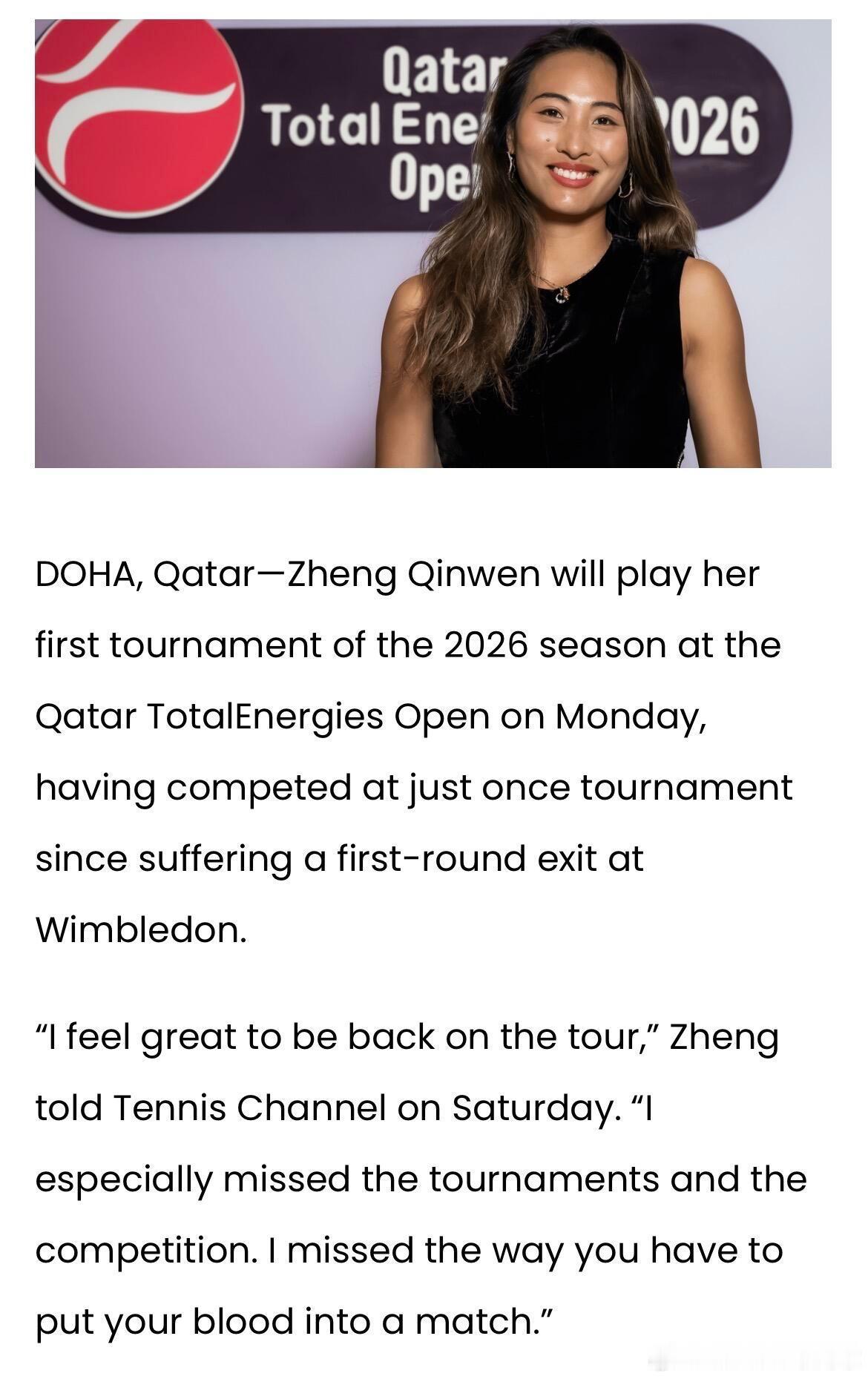 郑钦文将于周一在卡塔尔多哈公开赛开启她2026赛季的首秀。自去年温网首轮出局以来,郑钦文由于伤病困扰仅参加过一项赛事,她在周六接受Tennis Channel的采访,谈到了自己的感受。