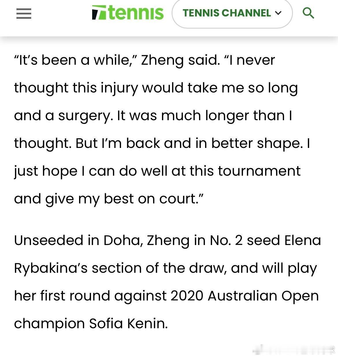 在多哈站比赛中,郑钦文作为非种子选手抽到了2号种子莱巴金娜所在的半区,她首轮的对手将是2020年澳网冠军肯宁。郑钦文说恢复期比想象中长wta