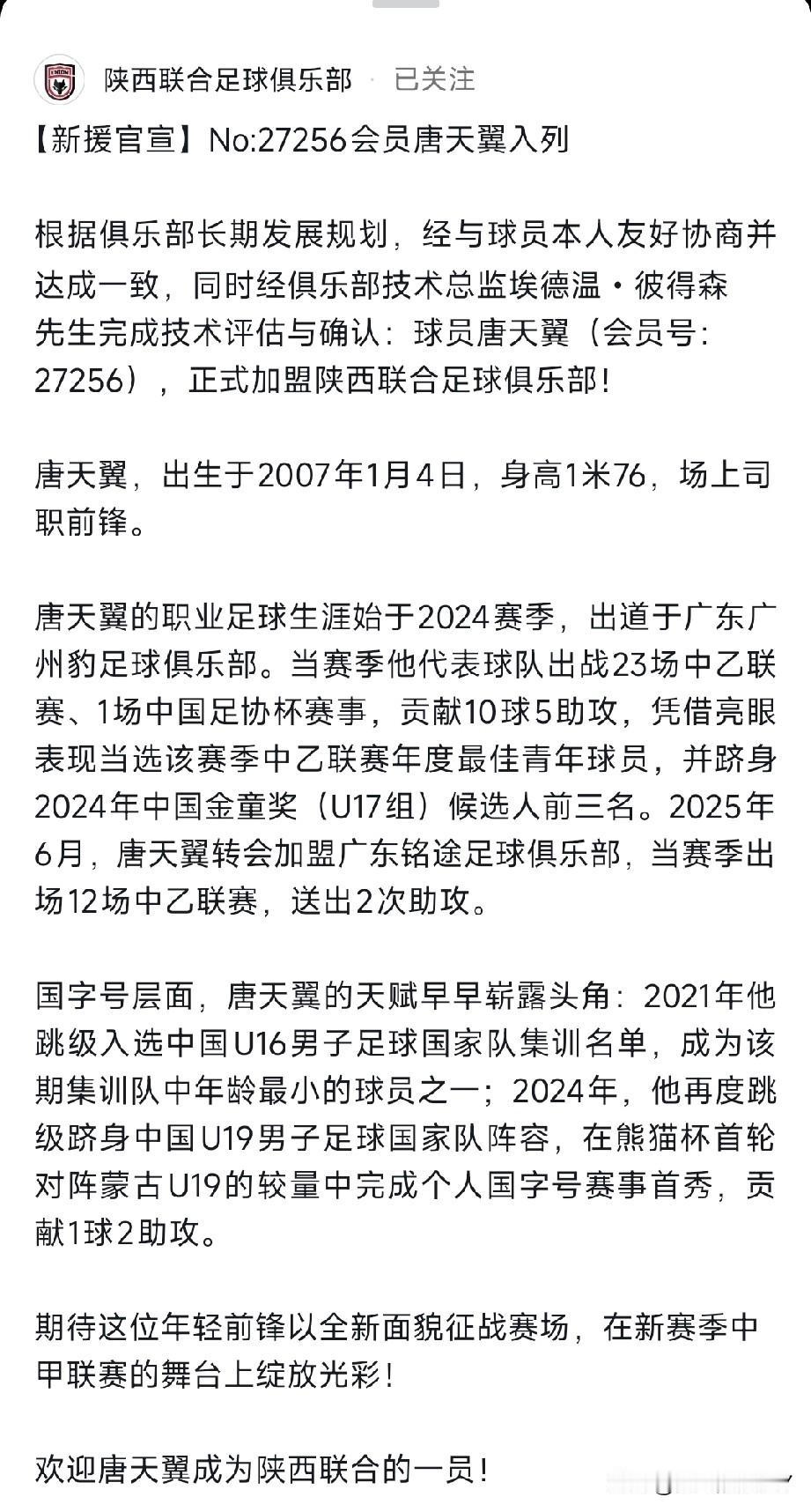 刚刚西北狼陕西联合俱乐部又挤牙膏的官宣了一位球员,就是大家已经传了好久的年轻球员唐天翼,终于实锤了。 希望如俱乐部和陕西球迷期待的那样,唐天翼能以崭新的面貌为陕西联合,在新赛季的中甲联赛中绽放光彩。