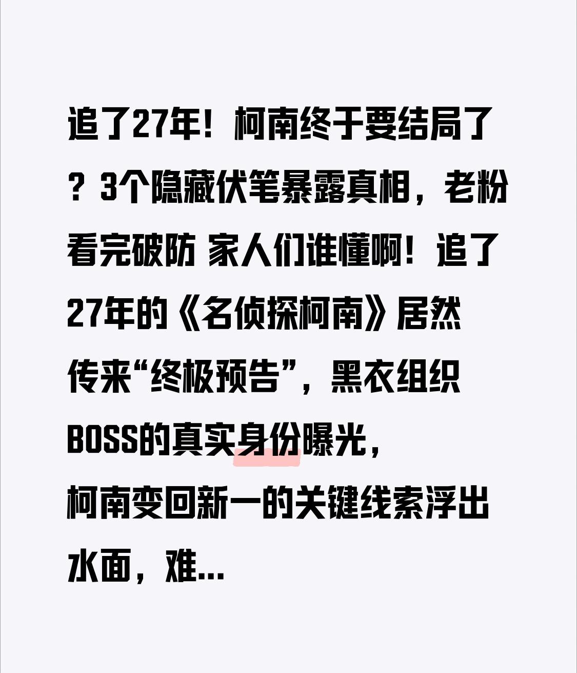 追了27年!柯南终于要结局了?3个隐藏伏笔暴露真相,老粉看完破防 家人们谁懂啊!追了27年的《名侦探柯南》居然传来“终极预告”,黑衣组织BOSS的真实身份曝光,柯南变回新一的关键线索浮出水面,难道我们真的要和童年说再见了? 作为承包了80后到00后青春的神剧,从1996年开播到现在,柯南已经更新了1100多集,剧场版拍到第27部,可主角柯南依旧是那个“一年级小学生”。当年蹲在电视机前追更的我们,如今都已经上班结婚生子,而柯南还在破解一桩桩悬案,网友调侃:“我都老了,柯南还没小学毕业”。 但最近漫画最新话的一个细节,让全网炸了锅!柯南在破解跨国案件时,无意间说出“黑衣组织的核心藏在铃木财团”,结合之前灰原哀提到的“APTX4869的终极秘密”,网友突然发现,原来27年来作者青山刚昌早就埋下伏笔。 更让人意外的是转折点——一直被当成“打酱油”的阿笠博士,居然在最新剧场版里展现出超强的格斗能力,而且他的实验室里藏着和黑衣组织同款的神秘符号。有网友扒出,阿笠博士的名字倒过来拼写,正好和“黑衣组织创始人”的代号高度重合,难道我们一直被作者骗了? 其实这些年,网上关于“结局”的猜测就没停过:有人说柯南最终会永远停留在小学生形态,和小兰相忘于江湖;也有人说灰原哀会为了救柯南牺牲自己,让新一回归正常生活;还有人脑洞大开,认为整个故事都是柯南的一场梦。 但真正让老粉破防的,是那些藏在剧情里的青春回忆。记得小时候看“图书馆杀人事件”被吓得睡不着觉,却还是忍不住熬夜追更;为柯南和小兰的“异地恋”着急,盼着新一早日归来;甚至模仿柯南的“真相只有一个”,在学校里当起“小侦探”。 如今再看柯南,我们看的早已不是悬疑案件,而是自己逝去的青春。那些和同学争论“谁是BOSS”的课间,躲在被窝里看漫画的夜晚,为角色命运流泪的瞬间,都成了最珍贵的回忆。 而作者最近在采访中透露,“结局已经构思完成,会给所有角色一个圆满的交代”。这个消息让老粉又期待又不舍:期待了27年的真相终于要揭开,可一旦结局播出,我们的青春也就真的画上了句号。 其实柯南的故事,早就教会我们很多道理:正义或许会迟到,但绝不会缺席;真正的爱情,是跨越时间和距离的等待;哪怕面对再强大的敌人,只要心怀勇气,就能找到真相。 追了27年,你最意难平的角色是谁?你心中的结局是什么样的?评论区聊聊你的青春回忆,点赞转发,一起等柯南的终极结局!