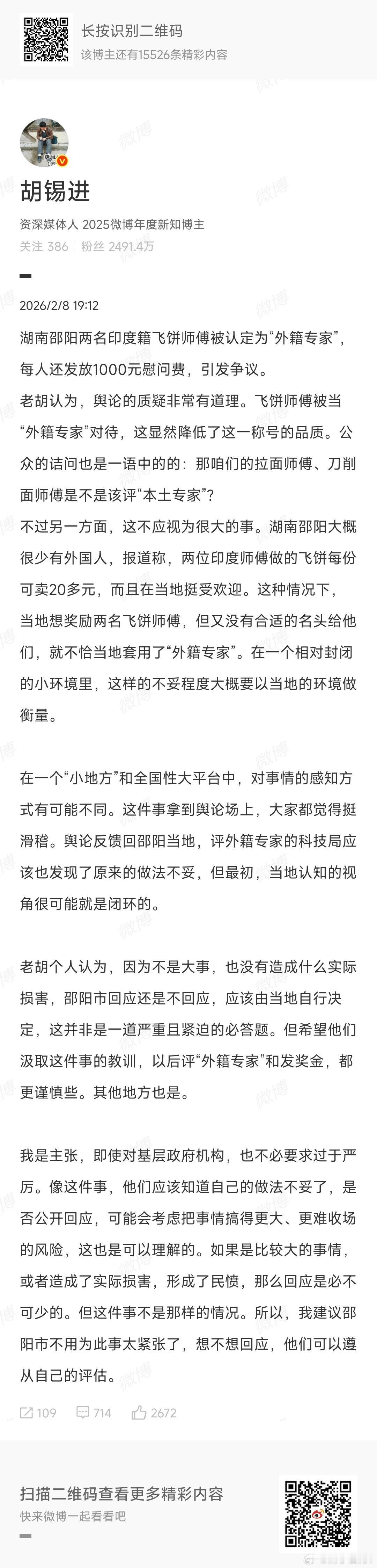 胡锡进这次的说法,实在是太和稀泥了,典型的用“小地方不易”模糊核心问题两名印度飞饼师傅被评“外籍专家”,发慰问费,根本不是“小环境认知闭环”的小事,而是外籍专家认定标准被滥用、公共资源被错配的原则问题。专家称号有其专业门槛和评定规范,不是当地想给谁就给谁的“名头”,拿这个给飞饼师傅,既是对真正外籍专家的不尊重,也是对基层评定工作严肃性的漠视,公众的质疑,本质是反感这种敷衍随意的行政行为。可老胡却一个劲强调“邵阳很少有外国人”“没实际损害”,甚至觉得当地回不回应都无所谓,还劝着别太紧张。这不是体谅基层,而是纵容滥用纳税💰。基层做事可以有考量,但不能突破规则底线,错了就是错了,一句“小地方没合适名头”根本站不住脚,更不该用“不必要求过严”来消解公众的合理监督。胡锡进谈飞饼师傅被认定外籍专家