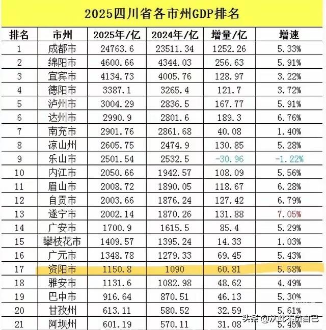 2025年四川各地市(地区)的经济成绩单来了,成都依然以遥遥领先的姿势独孤求败,排名第二的绵阳 ,虽然增长势头强劲,但仍然赶不上成都的零头!面对这一现实,各地市也无需妄自菲薄,毕竟成都是省会,加上市处成都平原核心地区,加上成都本身地盘就比很多地级市大,其下面的区市县数量省内最多,作为西部地区的经济腹地和交通枢纽,成都能快迅发展其实是四川之幸呢! 之前,宜宾与绵阳之间追得非常紧,甚至许多人认为,宜宾可能会超过绵阳,但西部唯一的科技城,肯定在发展上韧性十足,想追上没那么容易! 德阳作为重装之城市依然稳稳的排在省内第四,而泸州和达州分列第五和第六名,两市的差距非常小,达州的增速特别强劲,有赶超泸州的可能哦! 排名第七的南充虽然与达州仅有不到90亿和差距,但看到这个城市的增量和增速,估计今年想超前者希望渺茫。 排名第八的是三州之一的凉山州,其增量非常可观,让我们感觉,老少边穷地区也是有希望的! 让人尴尬的是排名第九的乐山,其增速和增量居然都是负数,乐山是省内旅游资源富集的城市,其美食也享誉川内外,不知道为什么经济发展居然拖了全省的后腿? 后面排位第10到13名的经济总量都非常接近,今年最有希望向前挪动的可能是遂宁这匹黑马,我们注意到其增长速度居全省之冠! 总之,四川经济的基本盘还是比较稳的,成都以外的各城市虽然经济体量比较小,但发展潜力和增长空间还是很大的,许多人经常吐槽,整个四川成都一城市独大,但笔者想说的是,作为内陆省,四川优先发展成都是现实的考量,成都不能做大做强,整个四川在国内就没有现在的存在感,一个省存在感太弱了就没有话语权,超过一半面积处于盆地的四川想吸引资本的关注就更难了!