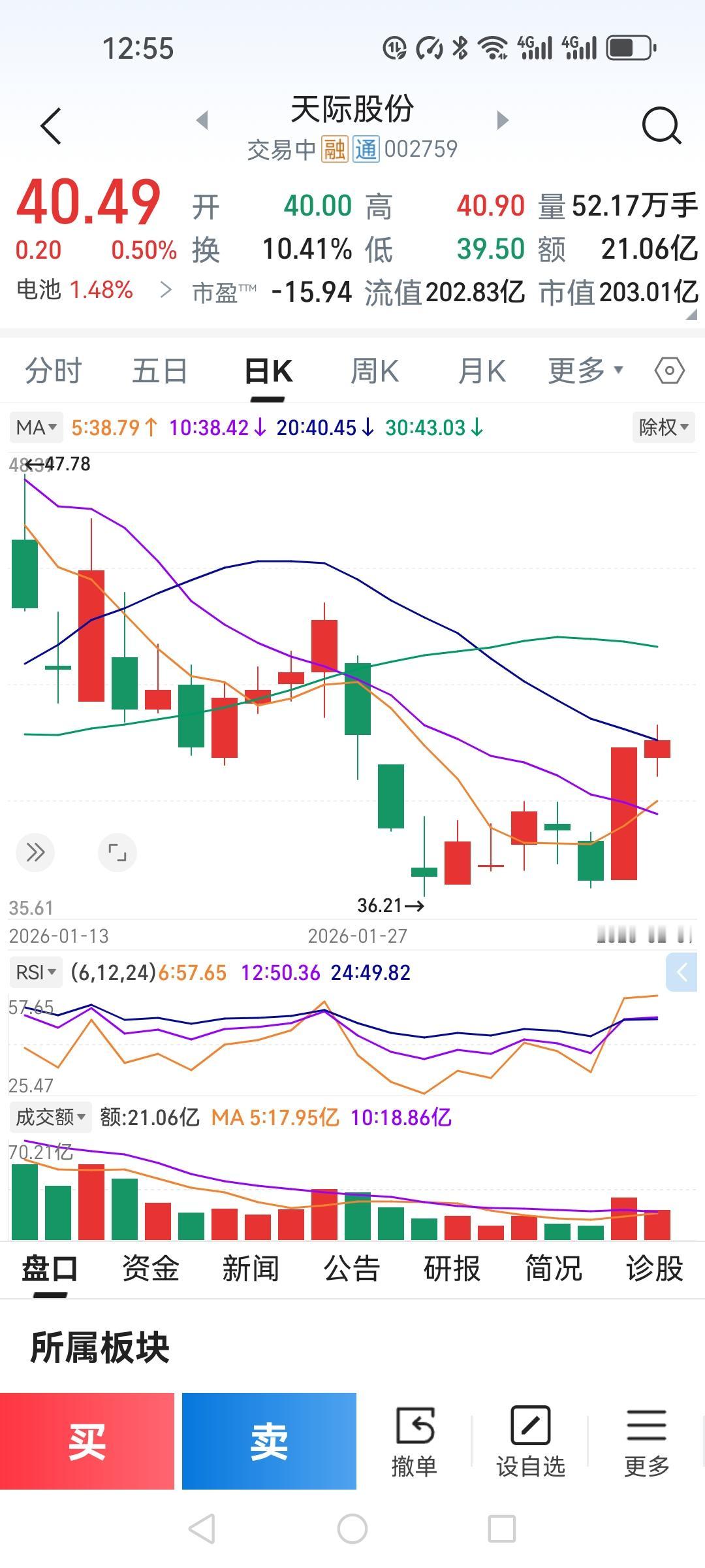 今天果然和我预测的一样,大盘高开高走,天际股份低开0.29元,40整数开盘,开盘瞬间探底39.5,立马就快速上冲到40.9,又开始回调,当时我还有点后悔没在开盘时买入,后来我看他的股价波动很大,上下跳跃的幅度较大,我就40元挂上买入,心想卖不卖上都无所谓,买上可以降低成本,买不上也不见得是坏事。万万没想到是在十点半的时候成交了,成交也是瞬间的事,一会又拉了起来,到收盘还在40.49。 昨天的涨停不知道今天下午能不能继续,从盘面看来还能有涨停的潜能,但是昨天的获利盘也阻止了股价的上涨,下午就看机构能不能再次出手。这就要看市场的情绪了。天际股份股票 我们炒股最大的敌人是谁?