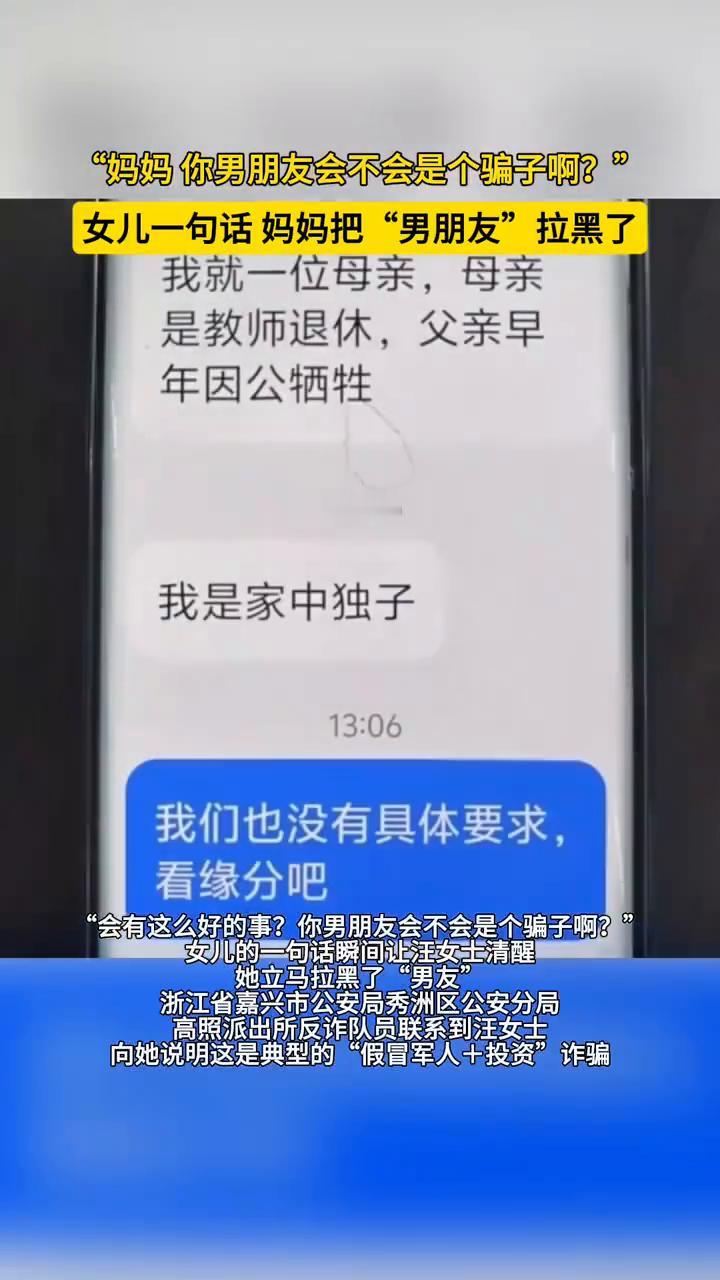女儿一句话妈妈把"男朋友"拉黑了。 近日浙江嘉兴,离异后独自抚养女儿的汪女士突然收到了一条相亲短信。孩子已经长大成人,汪女士也渴望有个依靠,便尝试进一步了解。这位自称"兵哥哥"的人不仅温柔体贴,家境还十分优越,两人还是老乡。在他的频频示好下,汪女士很快坠入了爱河。 想着男友职业特殊,汪女士没有丝毫怀疑,在男友的引导下下载了一款"指定App"。随着感情日渐深厚,男友开始有意无意地透露自己有"内部投资渠道",能获得高额回报。汪女士心生动摇,便和女儿分享了这个好消息。 女儿的一句话瞬间让汪女士清醒,她立马拉黑了"男友"。 浙江省嘉兴市公安局秀洲区公安分局高照派出所反诈队员联系到汪女士,向她说明这是典型的"假冒军人+投资"诈骗。 我就一位母亲,母亲是教师退休,父亲早退休了,我们也没有具体要求。