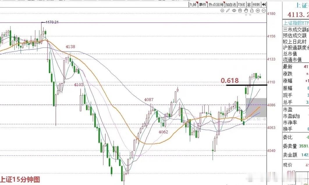 第二,今天上证指数的早盘最高点位到达4118点,这个点位同样的突破了上证指数15分钟级别反弹的0.618黄金分割位请看图二。对于0.618黄金分割位点位的突破,也是一种强势的走势。(0.618的反弹,黄金分割位,在4106点附近)因为这种突破有可能意味着短线市场的反弹会演变成为反转。我的意思是说,市场反弹的高度,还可以期待的更高一些。