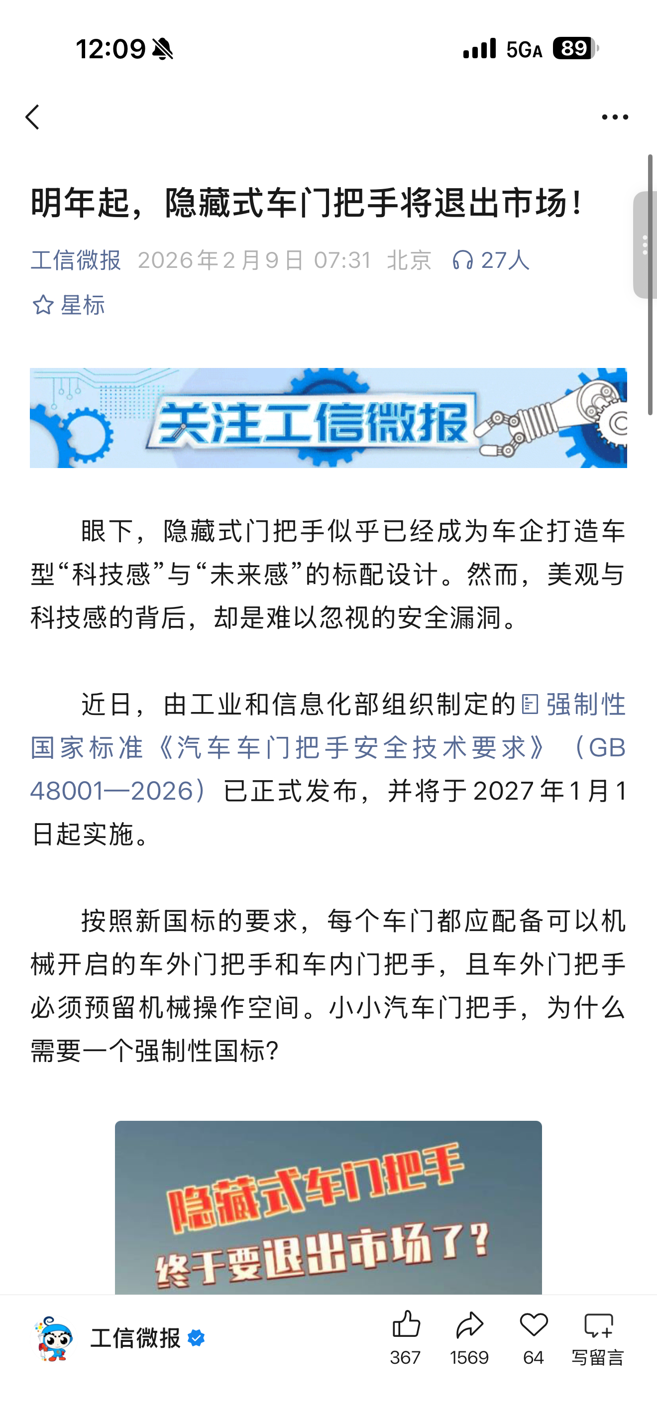 工信微报:明年起,隐藏式车门把手将退出市场!