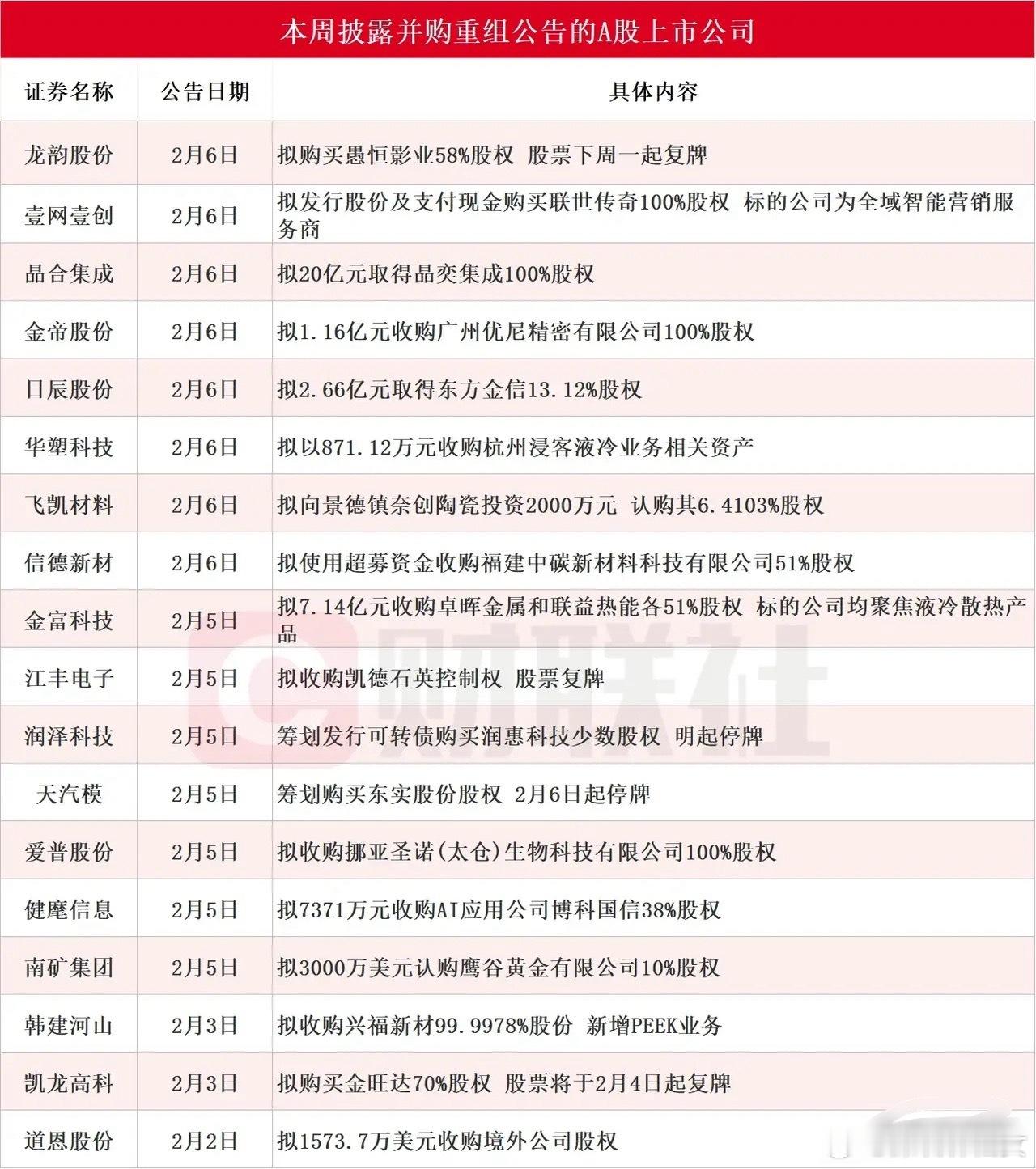 最新并购重组公司梳理!本次披露并购重组公告的A股披露并购重组公告的A股公司集中在2月2日至6日,涉及行业广泛,包括影视、电商营销、半导体、精密制造、液冷散热、新材料、AI应用、黄金矿业等。并购目的以产业链整合、新兴赛道布局、跨界业务拓展为主,部分公司伴随股票复牌或停牌,反映出企业在数字经济、高端制造、新能源等产业趋势下的主动调整与扩张意图。个股梳理分析1. 龙韵股份:2月6日公告拟购买愚恒影业58%股权,股票于下周一复牌。此次并购将拓展影视内容业务,丰富公司营收结构,强化在文化传媒领域的布局,有望借助标的公司资源提升内容端竞争力。2. 壹网壹创:2月6日拟发行股份及支付现金购买联世传奇100%股权,标的为全域智能营销服务商。交易将完善公司电商营销生态,强化品牌服务能力,助力拓展多元化营销场景,提升客户覆盖广度。3. 晶合集成:2月6日拟以20亿元取得晶奕集成100%股权。此次收购将强化半导体制造产能布局,巩固公司在晶圆代工领域的行业地位,深度受益于芯片国产替代的产业趋势。4. 金帝股份:2月6日拟以1.16亿元收购广州优尼精密有限公司100%股权。交易将拓展精密制造业务板块,完善产业链布局,借助标的公司技术积累提升精密零部件供应能力,增强盈利弹性。5. 日辰股份:2月6日拟以2.66亿元取得东方金信13.12%股权。此次布局大数据领域,探索食品加工与数据技术的融合路径,拓展业务边界,为公司长期增长注入新动能。6. 华塑科技:2月6日拟以871.12万元收购杭州浸客液冷业务相关资产。交易将切入液冷散热赛道,适配算力基础设施建设需求,与公司新能源储能业务形成协同效应,提升技术服务能力。7. 飞凯材料:2月6日拟向景德镇奈创陶瓷投资2000万元,认购其6.4103%股权。此次布局陶瓷新材料领域,将拓展电子材料的应用场景,增强公司技术储备,助力在高端材料领域的突破。8. 信德新材:2月6日拟使用超募资金收购福建中碳新材料科技有限公司51%股权。交易将完善负极材料产业链布局,强化产能供给能力,深度受益于锂电行业的持续增长。9. 金富科技:2月5日拟以7.14亿元收购卓晖金属和联益热能各51%股权,标的均聚焦液冷散热产品。此次加码液冷赛道,契合算力基建的产业趋势,将显著提升公司业务增长空间。10. 江丰电子:2月5日拟收购凯德石英控制权,股票复牌。交易将整合半导体靶材与石英材料资源,完善产业链布局,增强技术协同效应,进一步巩固在半导体材料领域的竞争优势。11. 润泽科技:2月5日筹划发行可转债购买润惠科技少数股权,股票明起停牌。此次交易将优化数据中心业务布局,提升运营效率,深度受益于数字经济基础设施建设的政策红利。12. 天汽模:2月5日筹划购买东实股份股权,2月6日起停牌。交易将拓展汽车零部件业务板块,深化产业链合作,增强公司在汽车制造领域的竞争力,适配新能源汽车产业升级趋势。13. 爱普股份:2月5日拟收购挪亚圣诺(太仓)生物科技有限公司100%股权。此次布局生物科技领域,将拓展食品添加剂业务边界,提升产品多元化程度,增强抗风险能力。14. 健麾信息:2月5日拟以7371万元收购AI应用公司博科国信38%股权。交易将切入AI应用领域,探索医疗场景与人工智能的融合路径,提升智慧医疗服务能力,拓展业务增长极。15. 南矿集团:2月5日拟以3000万美元认购鹰谷黄金有限公司10%股权。此次布局黄金矿业领域,将拓展资源类业务板块,增强盈利稳定性,对冲传统矿山机械业务的周期波动。16. 韩建河山:2月3日拟收购兴福新材99.9978%股份,新增PEEK业务。交易将布局高性能新材料领域,优化业务结构,提升技术壁垒,为公司带来新的盈利增长点。17. 凯龙高科:2月3日拟购买金旺达70%股权,股票于2月4日复牌。此次收购将拓展尾气处理产业链,强化商用车后市场布局,提升技术服务能力,适配环保政策升级需求。18. 道恩股份:2月2日拟以1573.7万美元收购境外公司股权。交易将拓展海外业务布局,深化新材料领域的全球化布局,提升公司在国际市场的竞争力。总结本周的并购重组事件呈现出明显的产业导向:一方面,半导体、液冷散热、AI应用等新兴赛道成为布局重点,反映出企业对数字经济与高端制造趋势的积极响应;另一方面,传统行业公司通过跨界并购拓展业务边界,寻求第二增长曲线。部分股票的复牌或停牌也为市场带来短期交易性机会,后续需关注并购完成后的业务协同效应与业绩释放能力。本文涉及资讯、数据等内容来自网络公共信息,仅供参考,不构成投资建议!