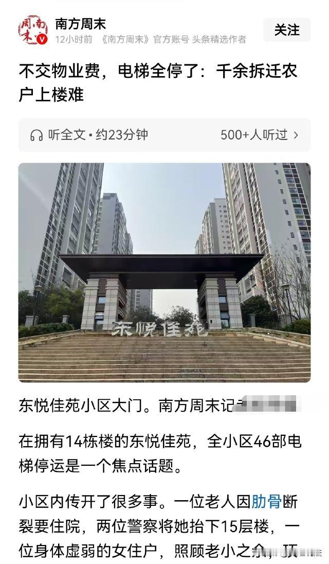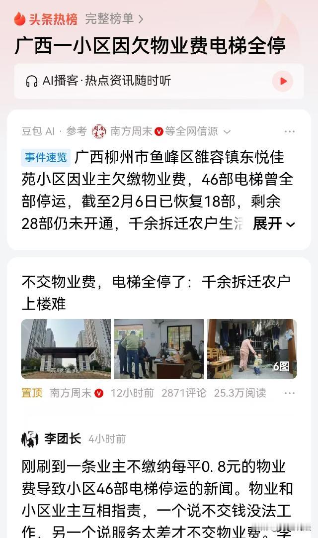广西柳州,某拆迁安置小区46部电梯全部停运,上千农户回家难。居民怨声载道,称物业不作为服务差,可物业也叫苦连天,说每平8毛物业费,欠费率高达67.11%,业主欠费444万,他们连工资都开不下来,他们也不是做慈善的,实在垫付不起! 据、南方周末报道,这起闹剧就发生在鱼峰区雒容镇某小区。 这个小区是一个拆迁安置小区,住的都是之前附近的农户,物业服务经理为王某。 小区电梯停运,是从2025年11月开始的,起因很简单,当地管理部门对电梯进行年检,发现电梯不合格,责令停梯。 这一停运,物业和的居民矛盾彻底失控了。 据王某说,他们和业主的矛盾由来已久。 该小区的物业费为每平米8毛钱,这在整个柳州市,都属于垫底水平。可是,业主们还是嫌费用太贵。 王某说,小区里住的很多都是农村老人,他们不理解为什么要交物业费,还经常在小区里开荒种地搞破坏,看到别人或者家里晚辈交费,他们甚至还会发火。 这些人认为,房子是他们的房子,住自己的房子,凭什么还要交钱? 可王某说,他们收的物业费包含电梯、消防设施、公共照明三部分,其中电梯和年检费为每平方3毛钱每年。 小区里有三台变压器,公共电费每个月就要五六万块钱,办公室工作人员、保安和保洁,加起来每个月工资也要8万多。 可是,交物业费的只是很少一部分,欠费率达到了67.11%,每个月收上来的费用只有七八万,最少的时候只有6万,连最基本开销都不够。 截止到2025年10月31日,业主已经欠了他们444万。 因为没有钱,小区里的公共设施坏了,也没有办法修,原本应该添置的东西,也没法添置。 可是在业主们眼里,这一切都是他们不作为导致的,还说如果他们服务好自己会不交钱吗? 业主跑到办公室,还拿出民法典,称不得以断水断电等方式催缴物业费。 可王某他们也有法可依,王某等人拿出特种设备安全法、特种设备管理条例和特种设备安全技术规范等,指出电梯年检不合格,也没有维保,依法应当停运。 王某称:开了电梯,万一出了事,就要我们来承担责任。 可是,大部分业主还是不愿意交费。 之前,一个住在15楼的老人肋骨骨折,最后还是报了警,由民警从14楼把她抬了下去。 有个女业主身体不好,因为要照顾一家老小不得不每天爬楼,最后累的住的三天院。 有一对住在高层的老夫妻,已经近一个月没有下过楼了。 因为电梯停运,小区的租户搬走了很多,附近的店铺生意也收到了严重影响。 业主怨声载道,有人称车子发生剐蹭,最后不了了之,有人称电瓶经常被盗,还有人说12栋防水存在问题…… 但是王某也很无奈,说到底还是没钱,监控坏了,防水有问题,他们都知道,他们进行过统计,小区里有600多项问题需要整改。 他们也想维修或者换新,但他们和业主们有合同,800块钱以下的物业承担,800以上的业主们分摊,可问题发现了,业主们却不愿意掏钱。 王某说,他们没有钱,动用公共维修金,业主又不签字,他们能有什么办法?总不能交8毛的物业费,却非要他们提供2块钱的服务吧? 从法律角度来看,业主与物业签订了物业服务合同,根据《民法典》第九百三十九条规定,建设单位依法与物业服务人订立的前期物业服务合同,以及业主委员会与业主大会依法选聘的物业服务人订立的物业服务合同,对业主具有法律约束力。 小区物业费每平米8毛,这是双方约定的价格,业主应按合同约定缴纳。 如今欠费率高达67.11%,欠费444万,业主的欠费行为构成违约。 那么,物业是否可以停运电梯呢? 依据特种设备相关法律法规,如《特种设备安全法》《特种设备管理条例》和特种设备安全技术规范等,电梯年检不合格且无维保,依法应当停运。 物业如果违规运行存在安全隐患的电梯,一旦发生事故,需承担相应责任,所以停运电梯是在履行法律规定的安全保障义务。 对于业主提出不得以断水断电等方式催缴物业费,依据的是《民法典》第九百四十四条第三款规定。 但此规定主要针对不合理催缴行为,而停运电梯是基于安全法规要求,并非以此催缴物业费。 现在,业主和物业之间已经陷入了死循环,小区到底怎么样才能恢复运行?您怎么看?