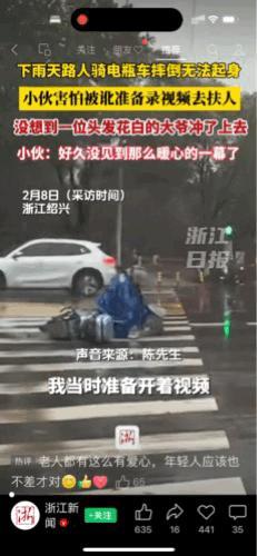 善良不分年龄,是刻在骨子里!浙江,一大爷在过马路时看到一女子连人带车摔倒在斑马线上,女子挣扎半天也没有爬起,大爷没有任何犹豫,立即走到摔倒在斑马线上的电瓶车前,伸手帮女子一起扶起。网友:老人家都有这样的精神,我们应该向老人家学习! 视频中,天空下着淅淅沥沥的小雨,寒冷的风夹着小雨吹得人瑟瑟发抖,湿滑的斑马线上,一位女子半蹲在路上,她的身边是笨重的摔倒的电瓶车 就在刚刚,她骑车过斑马线时,一个打着伞的小孩,从她的车前急匆匆地跑过去。为了不碰到孩子,女子一个急刹车,车子一滑摔倒了。 虽然女子没有受伤,但笨重的电动车却躺倒在了地上,女子站在旁边,正艰难地去扶车,但由于她穿着雨衣,力气也不够,试了好几次都没有扶起来。 正在这时,离女子几步开外的一位老大爷,快步走到女子跟前,低下身来询问女子,得知女子身体并无大碍,马上动手来帮女子。 只见大爷蹲了下去,把手中的伞靠放在肩膀上,双手握住车子的龙头,使劲地往上提,女子也一起用劲。 但车子太重,两个人费劲力气只把车子扶起了一点,但车子还是倾斜的,这时大爷突然伸出腿去,用膝盖顶住车身,踮起脚后跟,手腿并用终于把车子扶起。 发布视频的网友说,他看到车子摔倒后,准备去扶的,但又怕被讹诈,所以先开了视频,没想到,这位头发全白的大爷,却啥也没说,马上就过去帮忙了。 网友说,善良不分年龄,大爷的善良是刻在骨子里的。 网友还说,大家其实都不坏,就是怕担风险,怕受冤枉,做好事也不需要什么回报,只想踏踏实实,不用提心吊胆就行了。 小编说,以前大家都特别热心,看到谁有困难,二话不说就上去帮忙,就觉得这是应该做的。 可现在不一样了,人心复杂了不少。明明是好心做好事,反而要先担心会不会被赖上、会不会惹上麻烦、会不会好心办坏事。 真希望人与人之间能多一点信任,少一点算计,所有的善良都能得到尊重,能被温柔以待。 取材网络,侵删,个人观点,仅供参考。