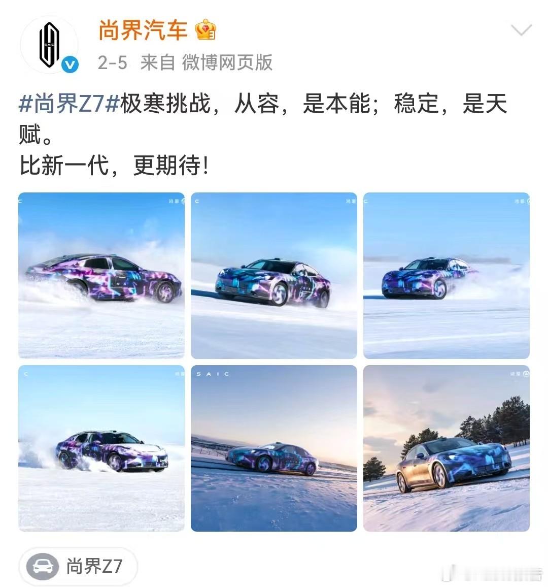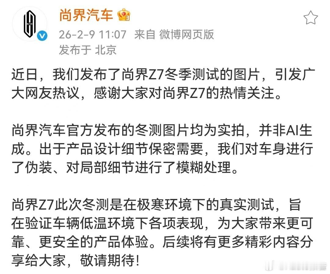 尚界汽车称冬测图片均为实拍尚界汽车辟谣冬测图片为AI生成2月9日,尚界汽车发文辟谣,称Z7冬测图片均为实拍,并非AI生成,仅因保密需求做了车身伪装与局部模糊处理。同时赵长江也辟谣智界S7车型未被取消。赵长江辟谣智界s7车型被取消