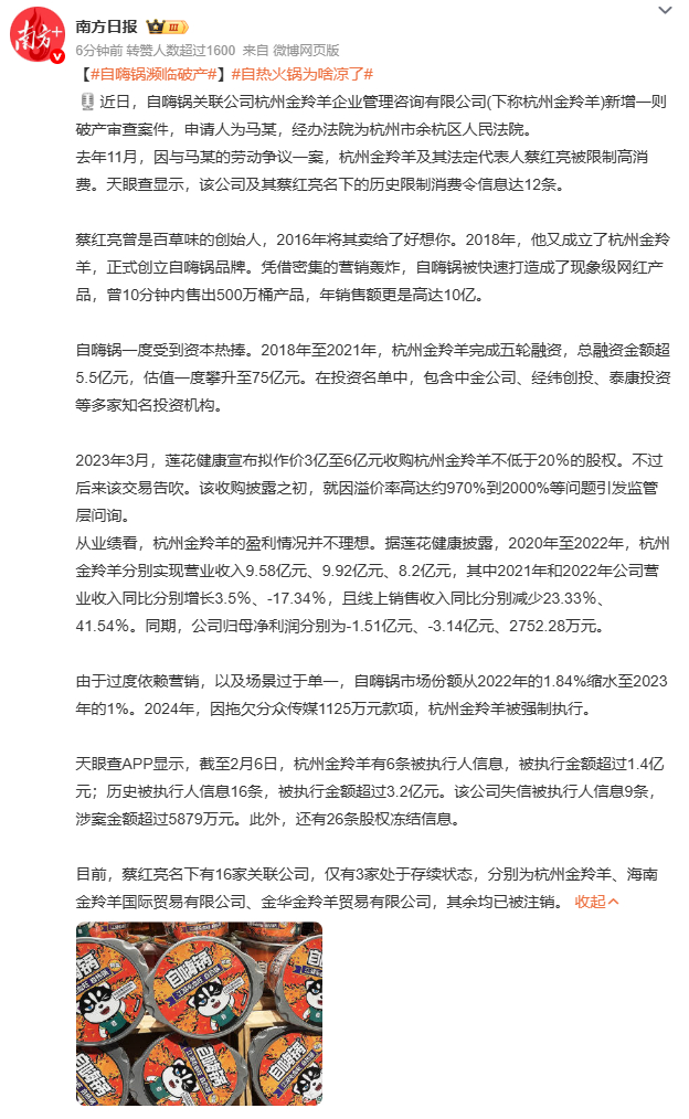 自嗨锅濒临破产杭州金羚羊历史被执行信息16条,涉案金额超3.2亿元,9条失信记录、26条股权冻结。2024年因拖欠分众传媒1125万元被强制执行,2025年创始人蔡红亮12次被限高。